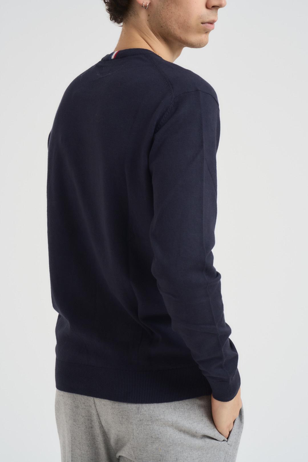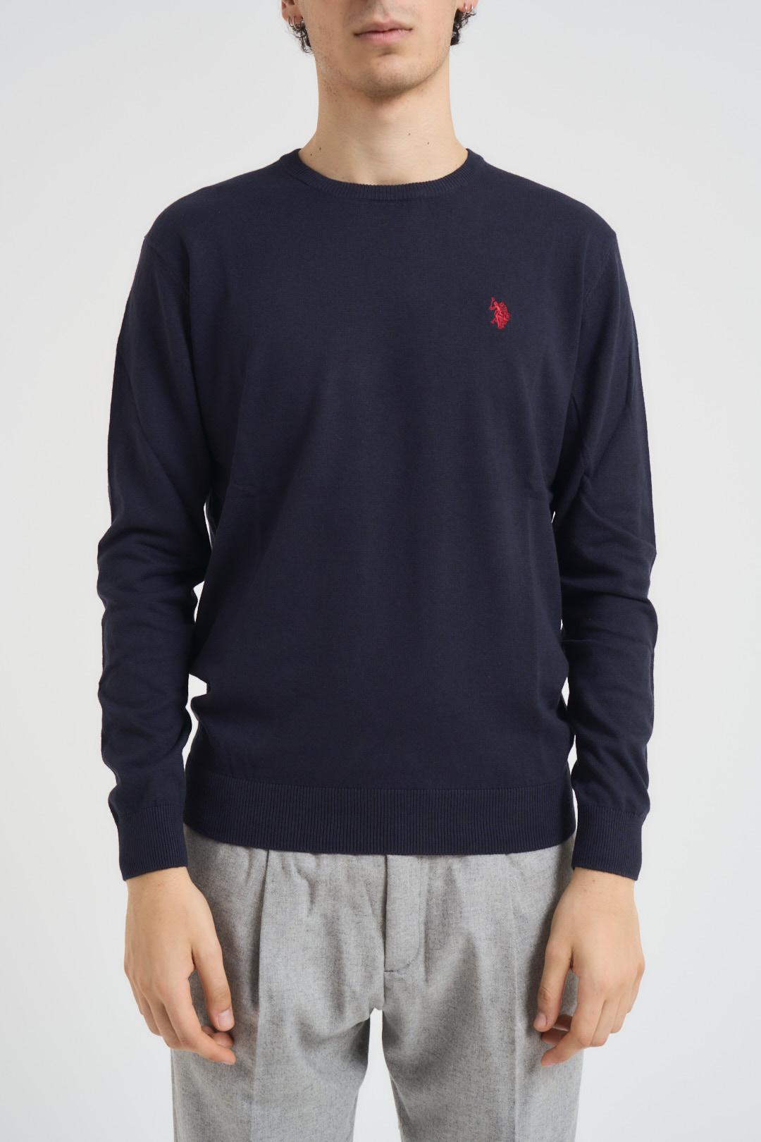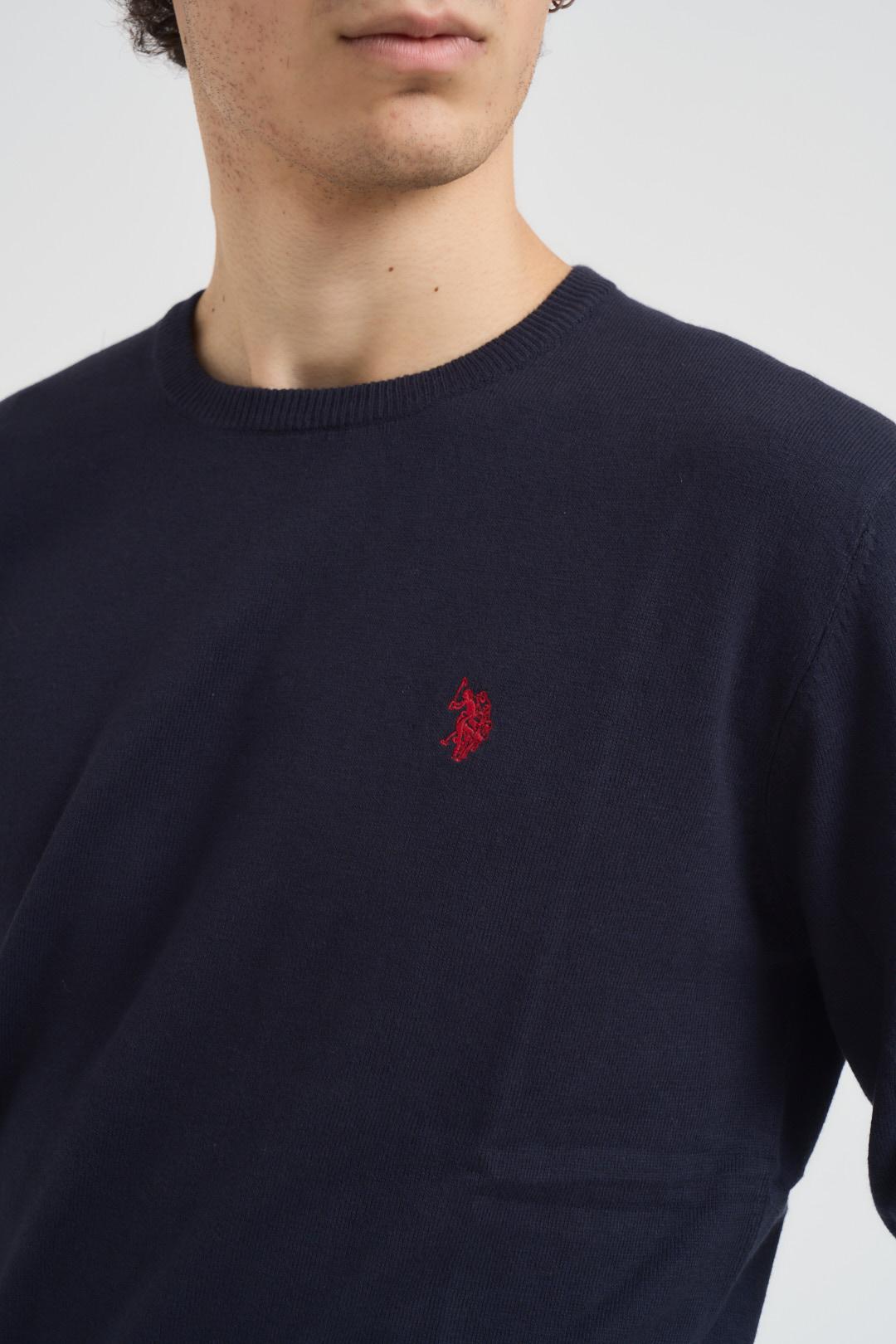 U.S. POLO Maglia uomo girocollo cotone e cashmere blu. Modello a manica lunga con girocollo raglan. Polsini e fondo a costina. Bandierina nei tre colori sul retro. Ricamo a filo del logo lato cuore. Composizione: 90% Cotone 10% Cashmere. Il modello è alto 190 cm e indossa la taglia L.