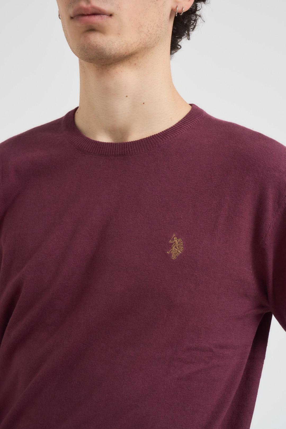 U.S. POLO Maglia uomo girocollo cotone e cashmere bordeaux. Modello a manica lunga con girocollo raglan. Polsini e fondo a costina. Bandierina nei tre colori sul retro. Ricamo a filo del logo lato cuore. Composizione: 90% Cotone 10% Cashmere. Il modello è alto 190 cm e indossa la taglia L.