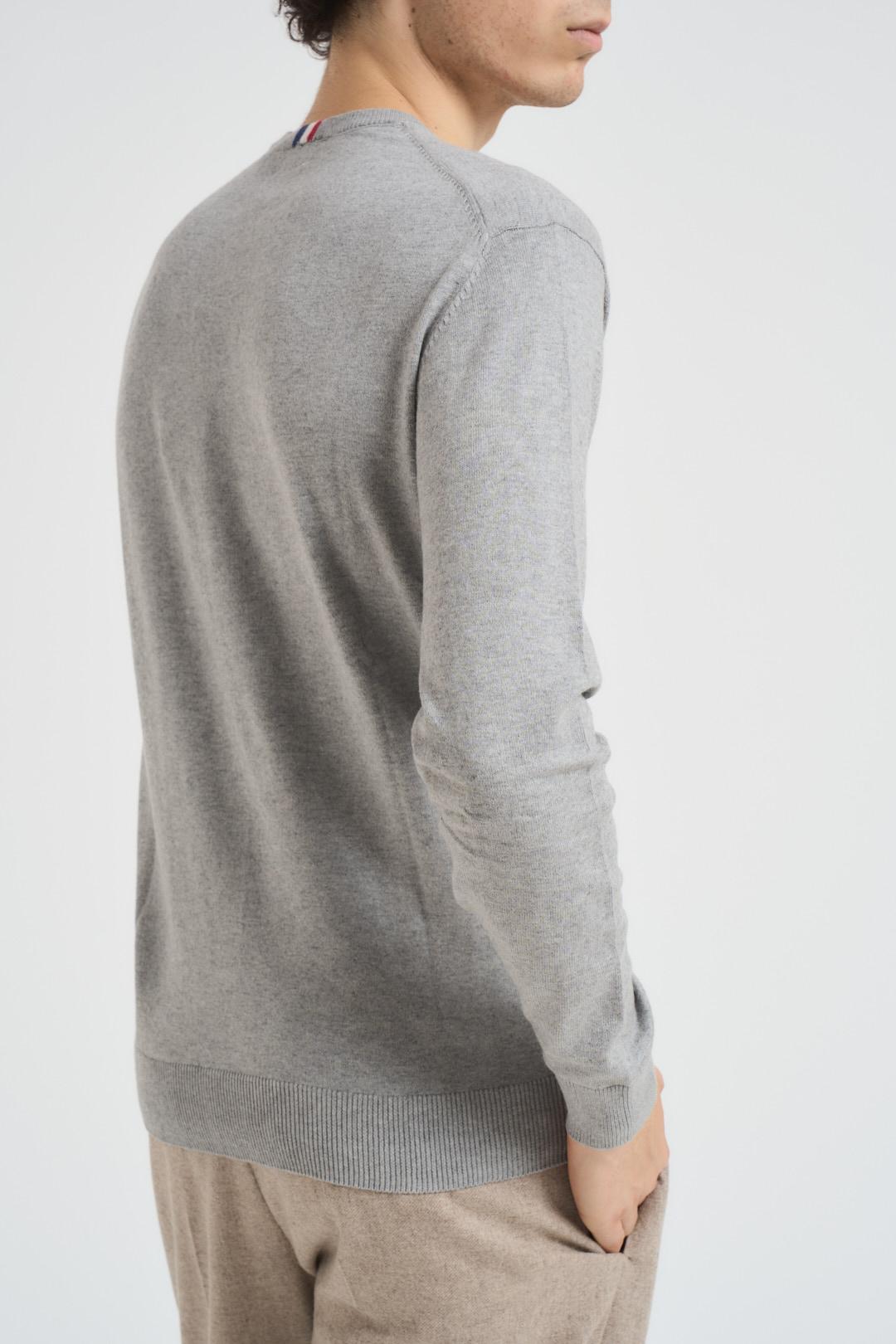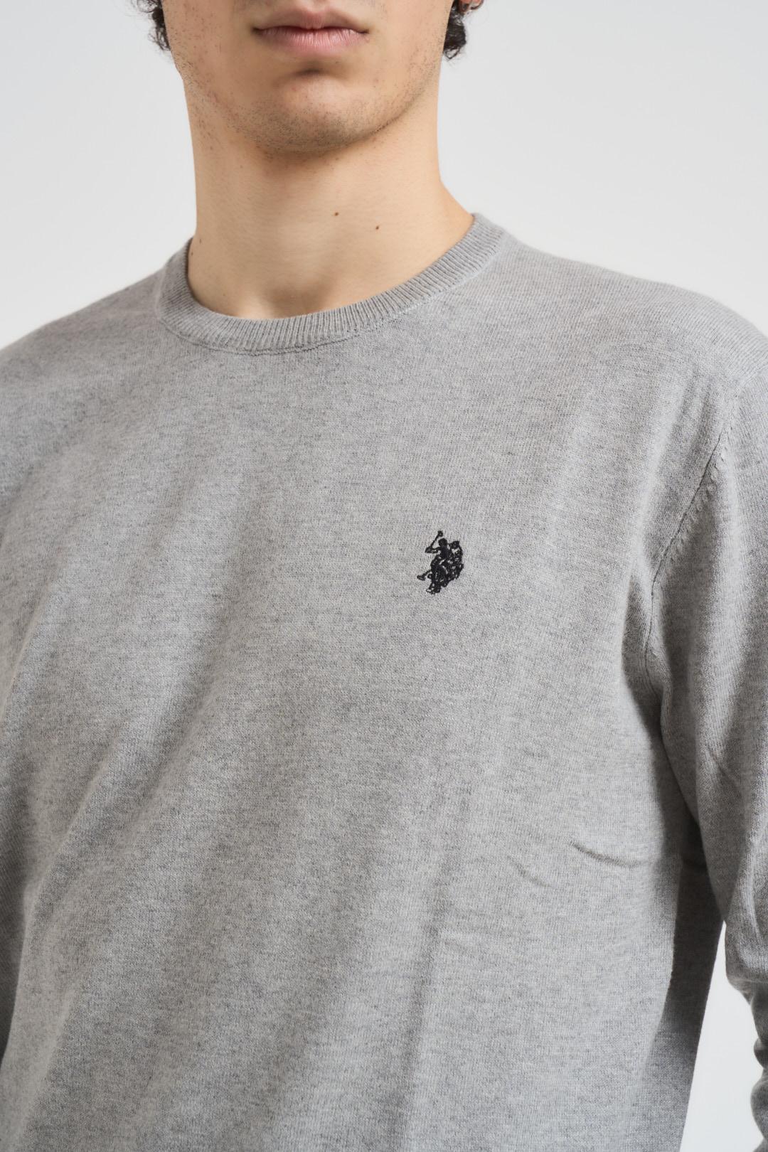 U.S. POLO Maglia uomo girocollo cotone e cashmere grigio. Modello a manica lunga con girocollo raglan. Polsini e fondo a costina. Bandierina nei tre colori sul retro. Ricamo a filo del logo lato cuore. Composizione: 90% Cotone 10% Cashmere. Il modello è alto 190 cm e indossa la taglia L.