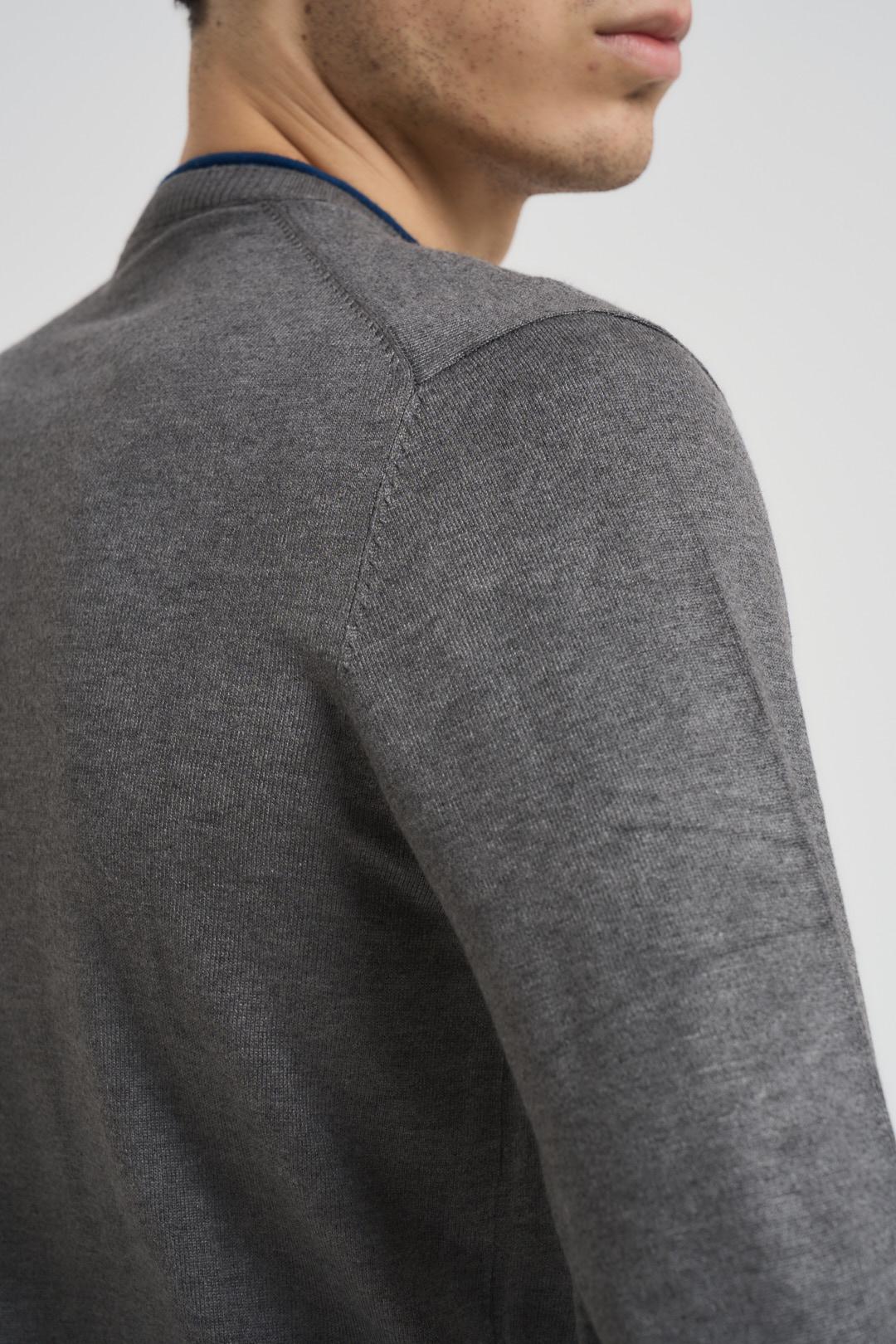 MARKUP Maglia uomo girocollo grigio chiaro. Modello a manica lunga con toppe in viscosa sui gomiti, dettagli a costine. Composizione: 80% Viscosa, 20% Nylon. Il modello è alto 190cm e indossa la taglia L.