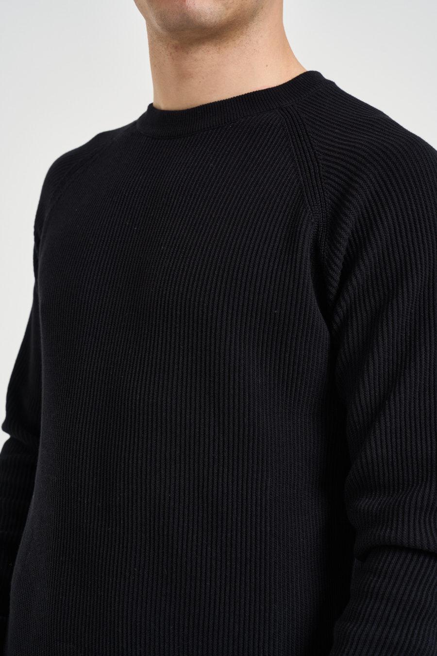 DIKTAT Maglia uomo girocollo nera. Modello in cotone di finezza 18, maniche lunghe, girocollo e regular fit. Composizione: 100% cotone. Il modello è alto 190 cm e indossa la taglia 50.