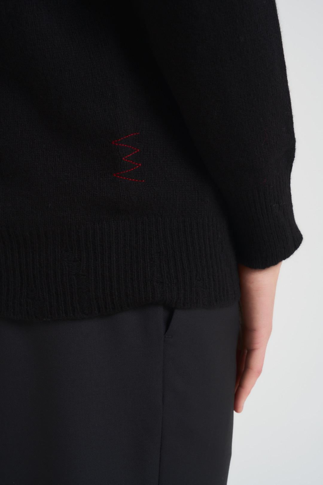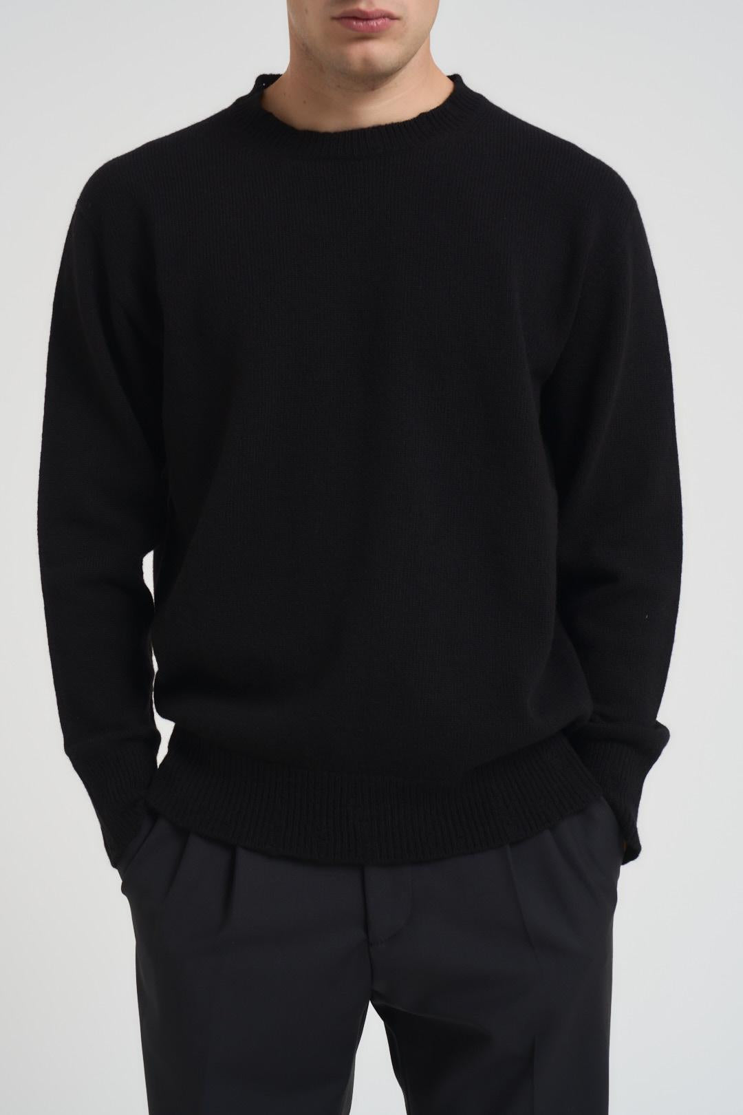 AMARANTO Maglia uomo girocollo nera. Modello regular fit. Manica lunga. Collo, polsi e orlo a costine. Cucitura a contrasto su fondo. Composizione: 90% lana, 10% cashmere. Il modello è alto 190 cm e indossa la taglia L.
