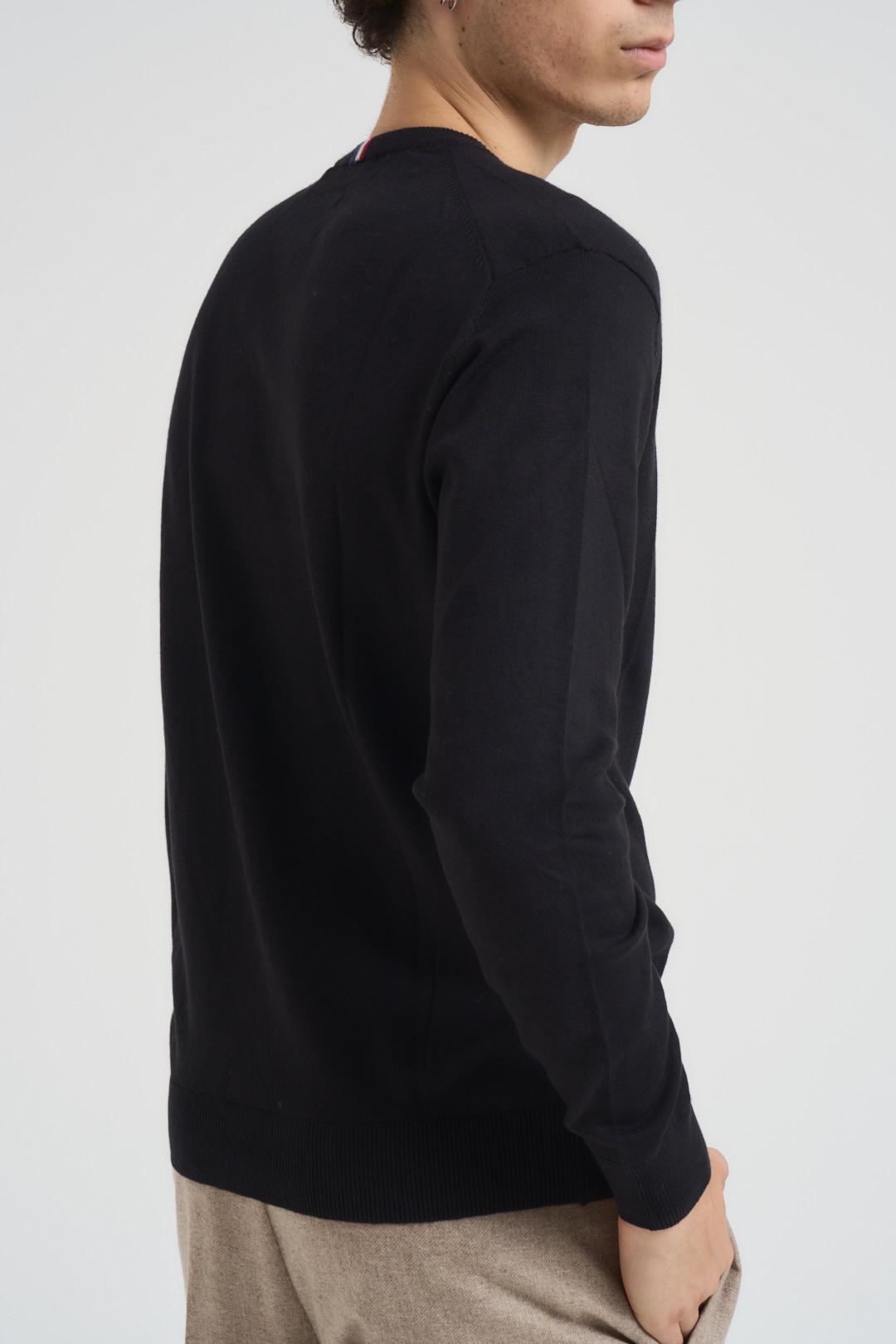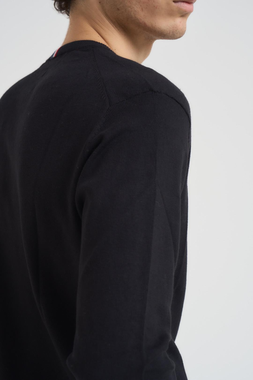 U.S POLO Maglia uomo girocollo cotone e cashmere nera. Modello manica lunga con monogramma ricamato a contrasto bianco sul petto a sinistra, polsini e cannolè a costine. Composizione: 90% cotone 10% cashmere. Il modello è alto 190 cm e indossa la taglia L.