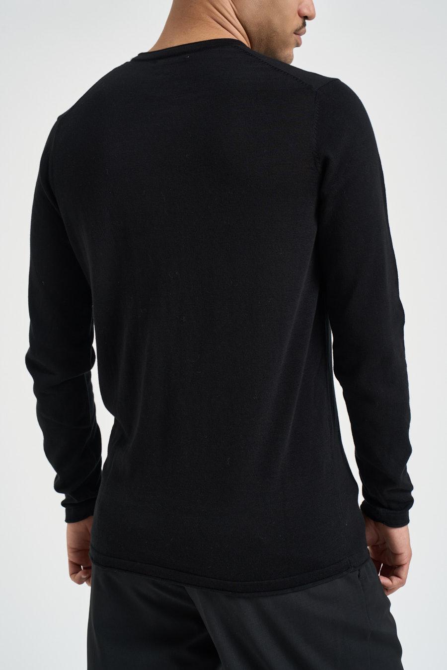 OVERD Maglia uomo girocollo nera. Modello a manica lunga con dettagli a costine. Composizione: 100% cotone. Il modello è alto 183cm e indossa la tg L.