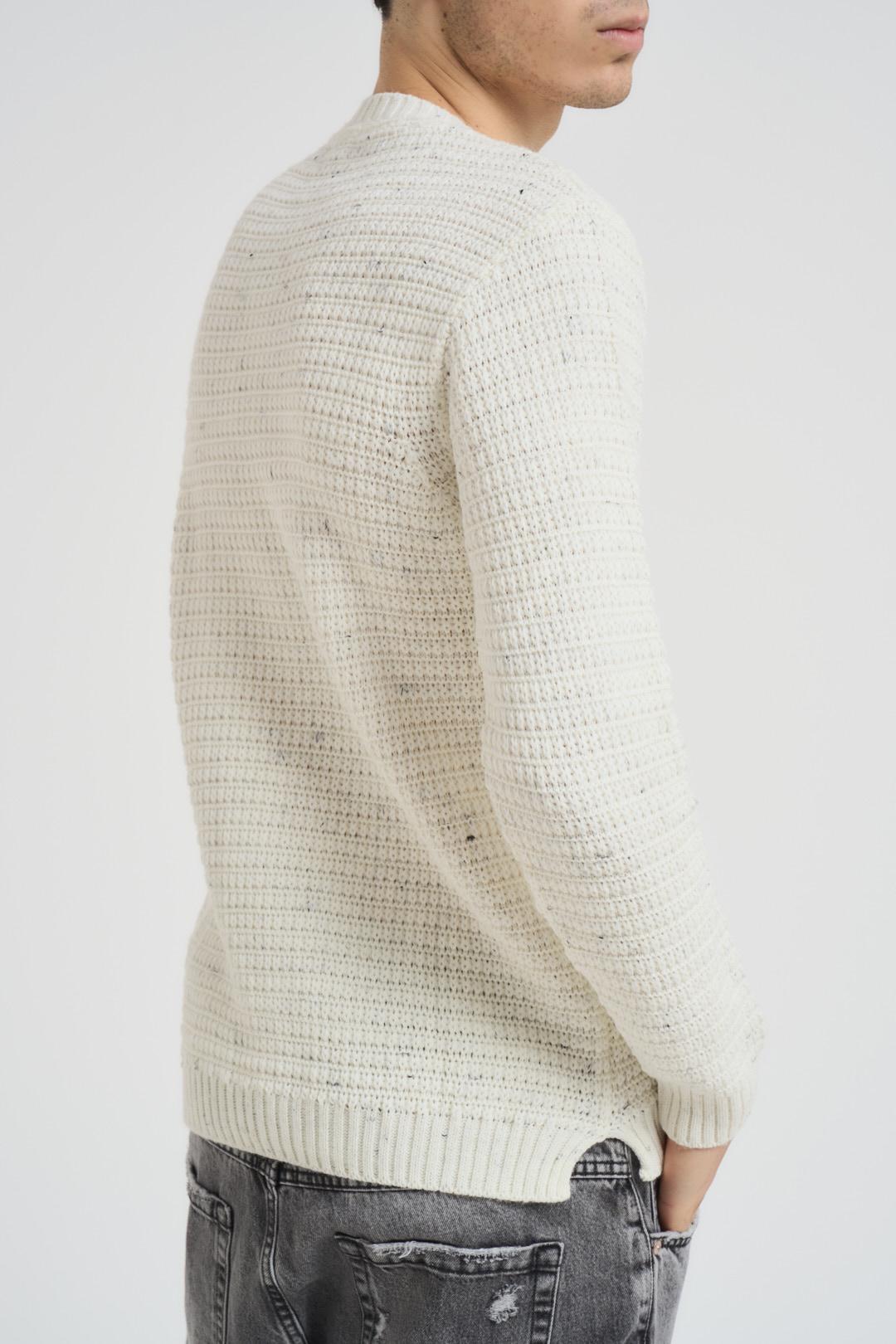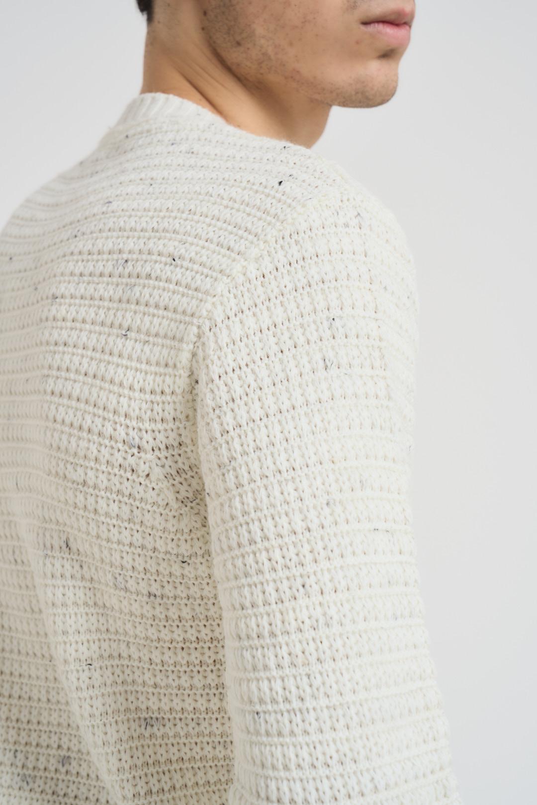 BL11 Maglia uomo girocollo panna. Modello a manica lunga con dettagli a costine. Regular fit. Composizione: cotone e poliestere. Il modello è alto 190cm e indossa la taglia L.