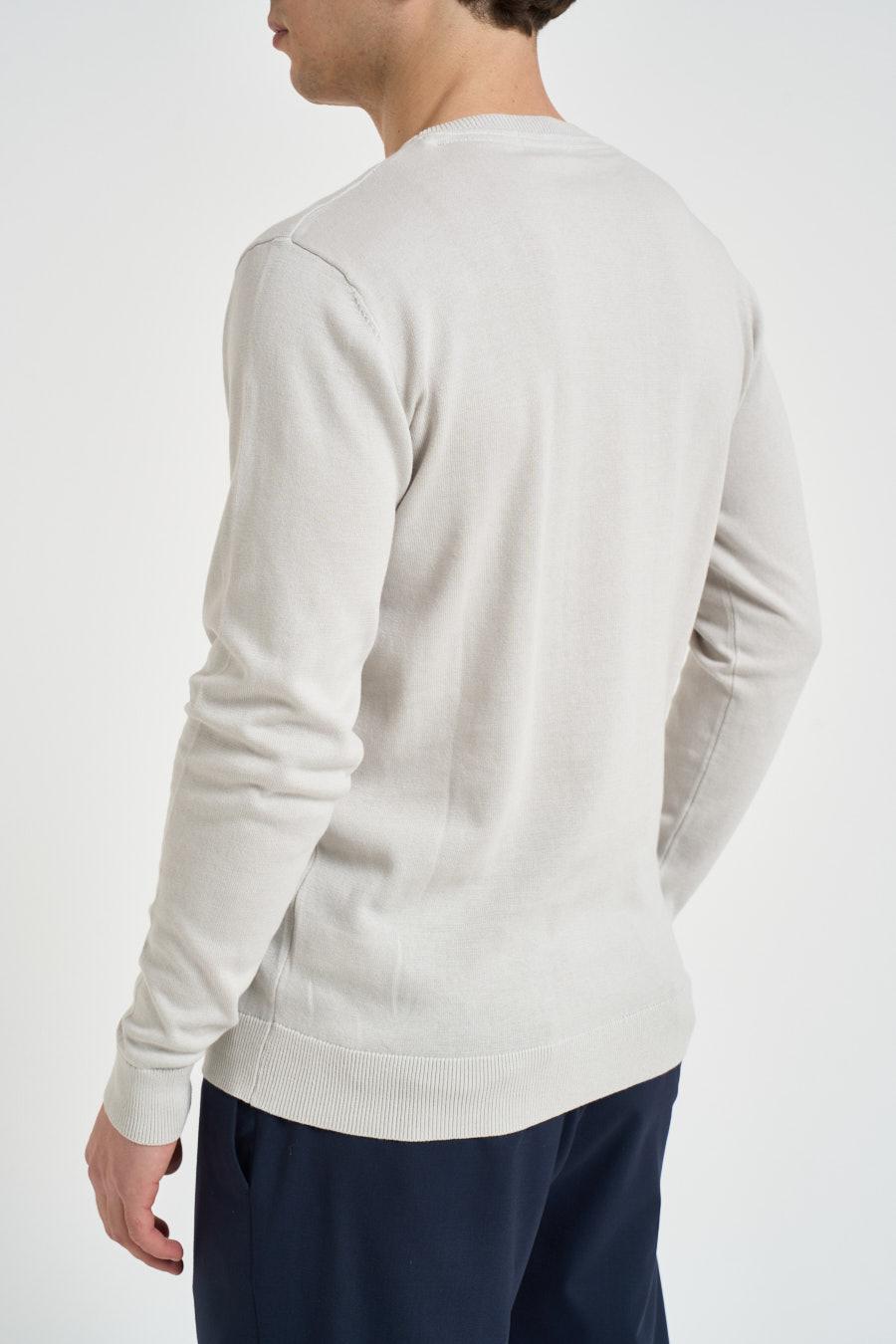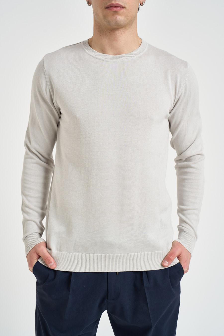 SEINSE Maglia uomo girocollo perla. Modello regular fit. Manica lunga. Dettagli a costine. Composizione: 100% cotone. Il modello è alto 190cm e indossa la taglia L.