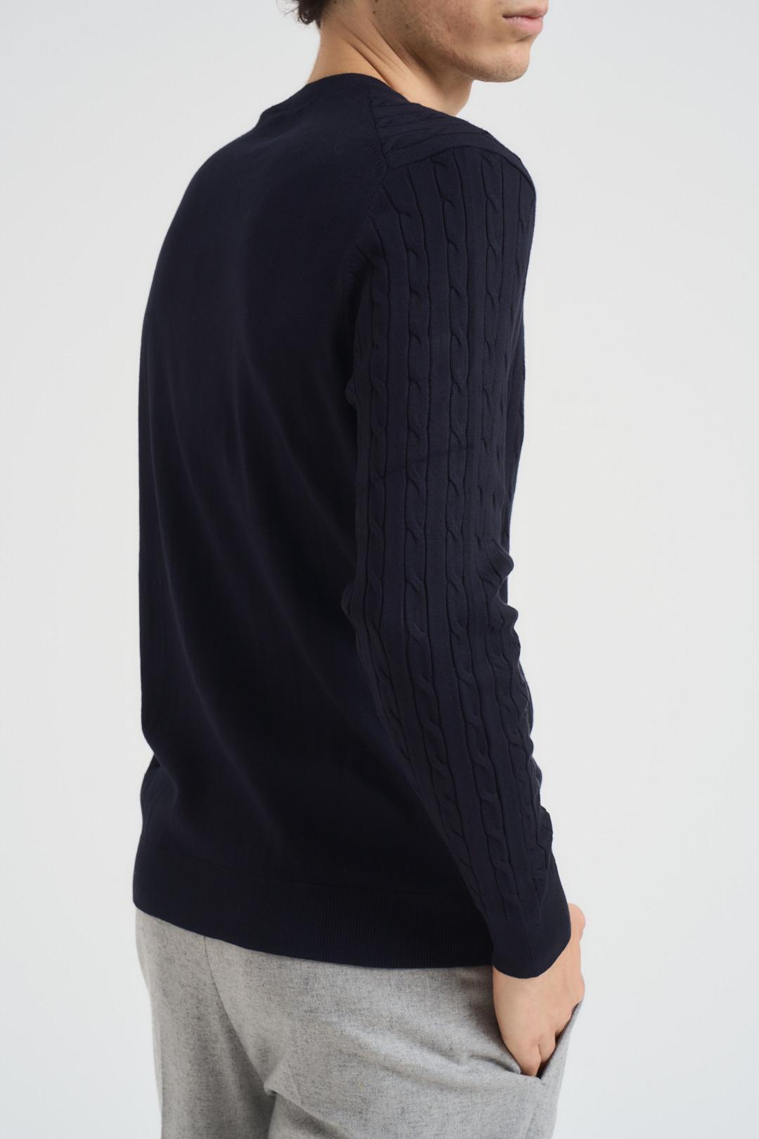 MARK UP Maglia uomo girocollo treccia blu. Modello a manica lunga. Collo, polsini e fondo a coste. Retro liscio. Composizione: 80% Viscosa 20% Nylon. Il modello è alto 190 cm e indossa la taglia L.