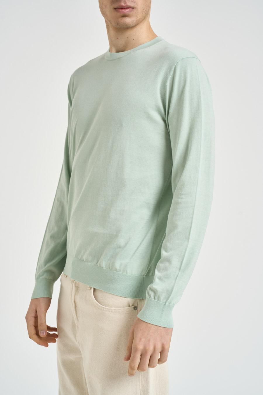 DIKTAT Maglia uomo girocollo verde acqua. Modello in cotone di finezza 18, maniche lunghe, girocollo e regular fit. Composizione: 100% cotone. Il modello è alto 190 cm e indossa la taglia 50.