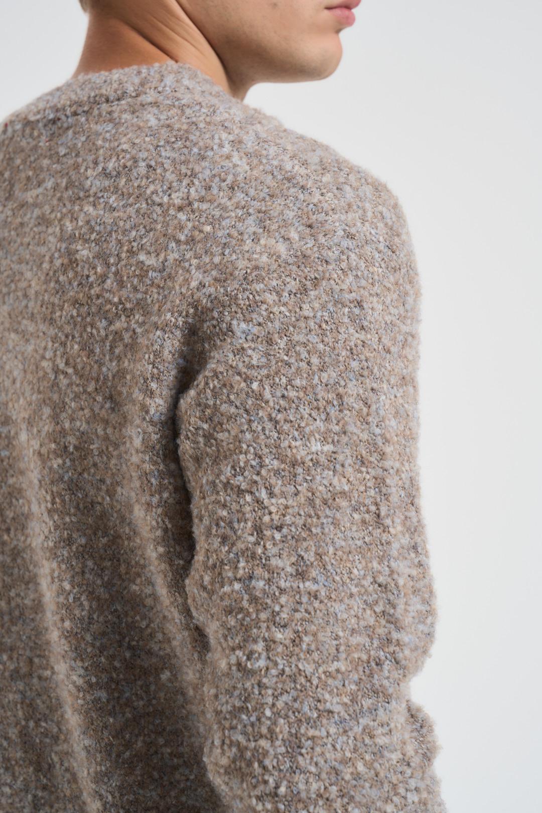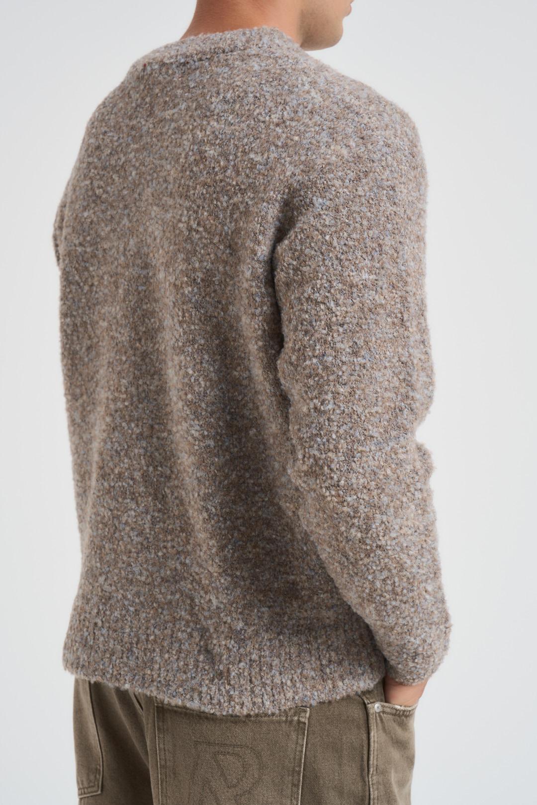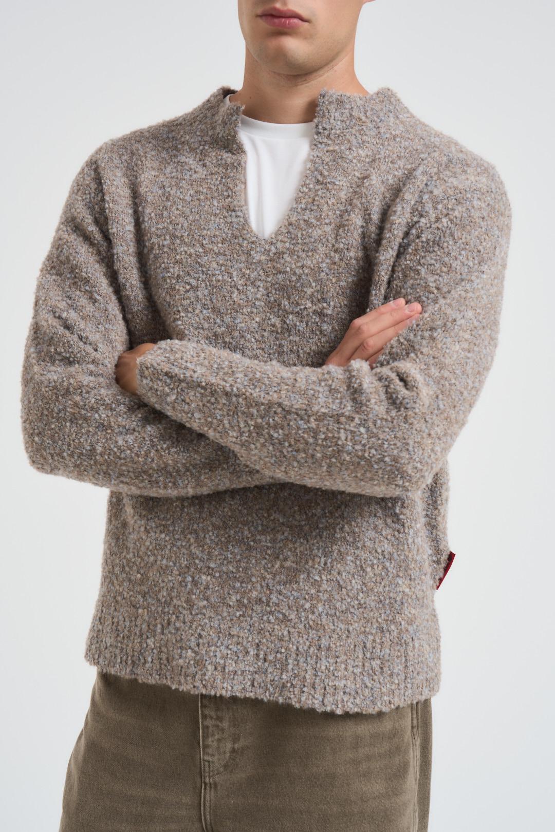 ACUPUNCTURE Maglia uomo scollo a V tortora. Modello a manica lunga con dettagli a costine, stile polo con tessuto pesante. Composizione: 66% poliestere 25% acrilico 9% lana. Il modello è alto 190 cm e indossa la taglia L.