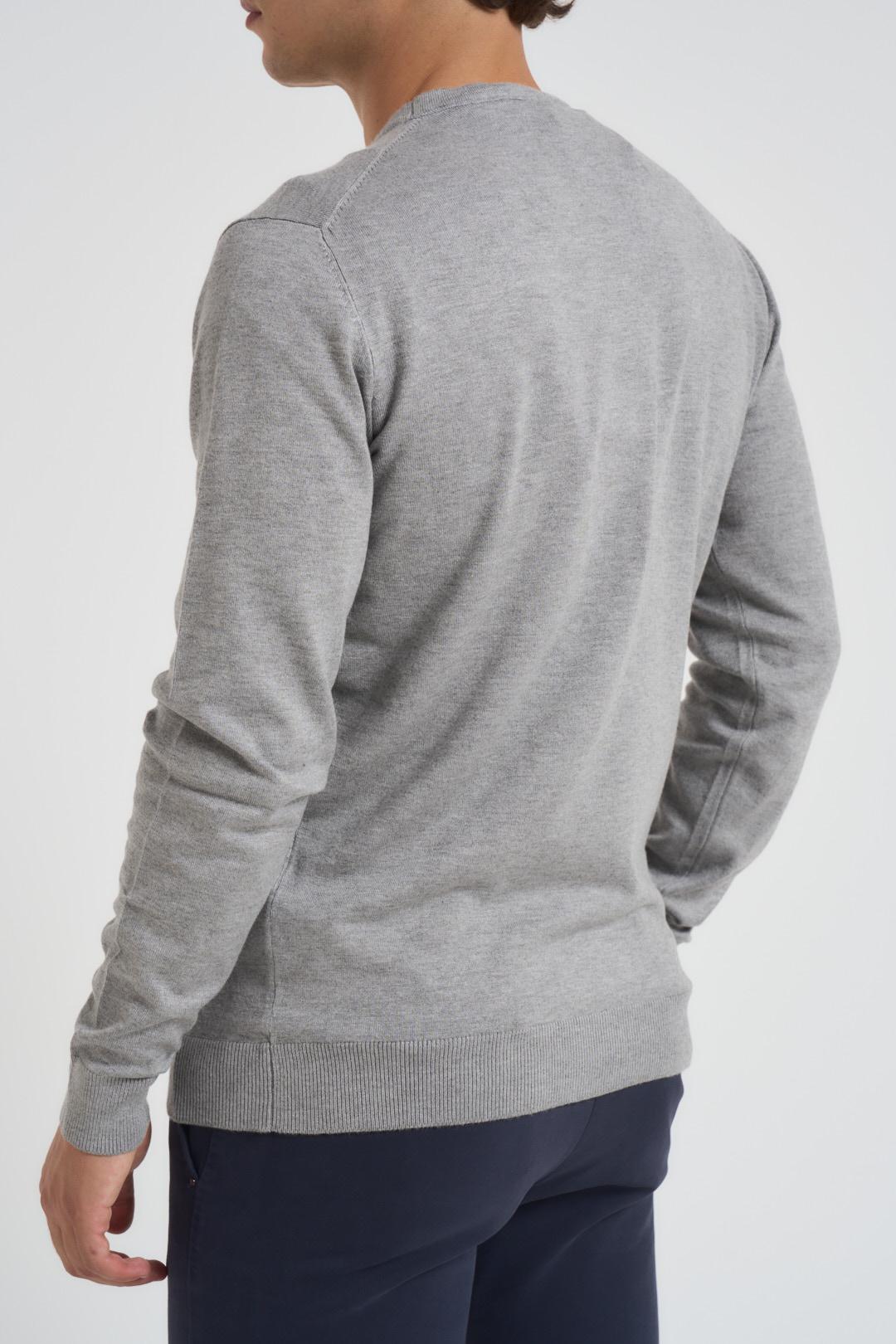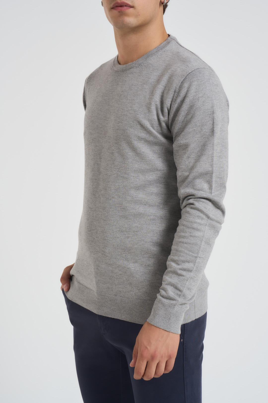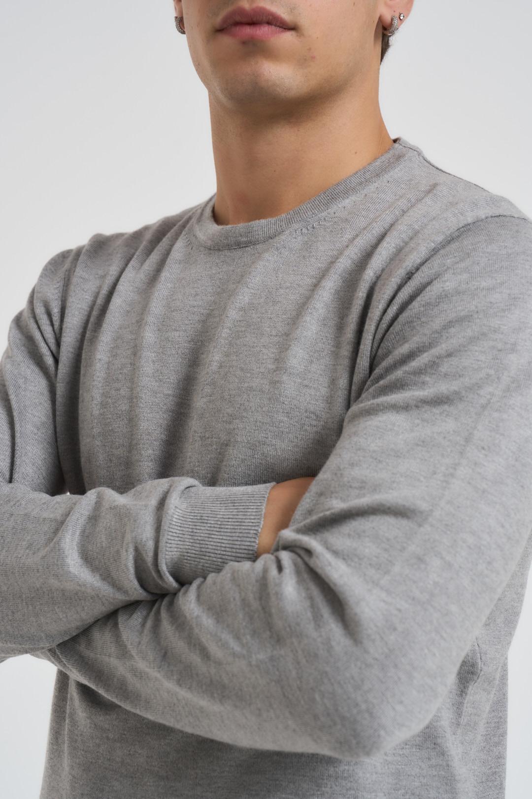 AGO E FILO Maglioncino basic girocollo. Modello girocollo, polso e fondo a costine. Composizione: 70% viscosa 30% pl. Colore: grigio melangiato. Il modello è alto 185cm e indossa la tg L.