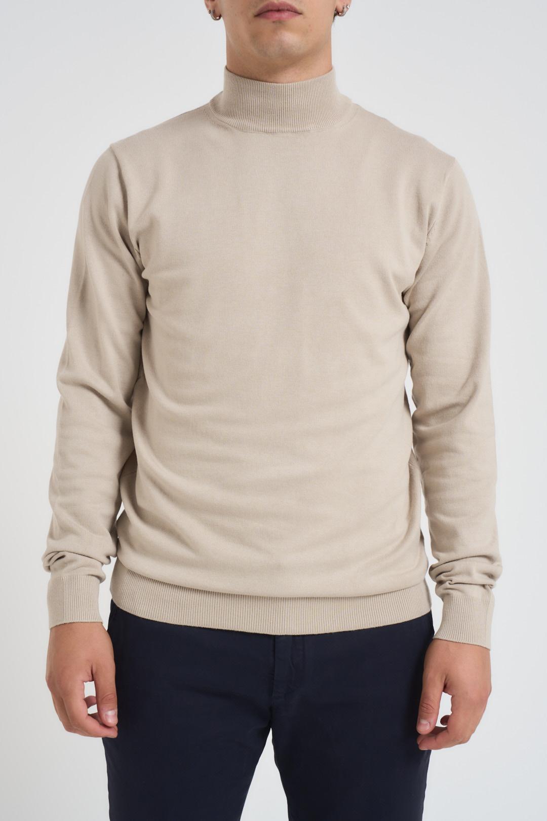 AGOEFILO Maglione a collo a alto uomo. Modello extrafine. Colore: gesso. Fondo a costine 1x1. Composizione: 70% viscosa 30% pl. Il modello è alto 185cm e indossa la tg 48.