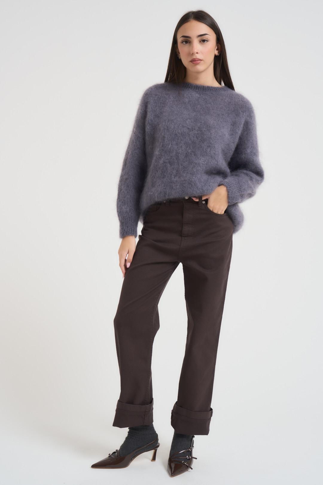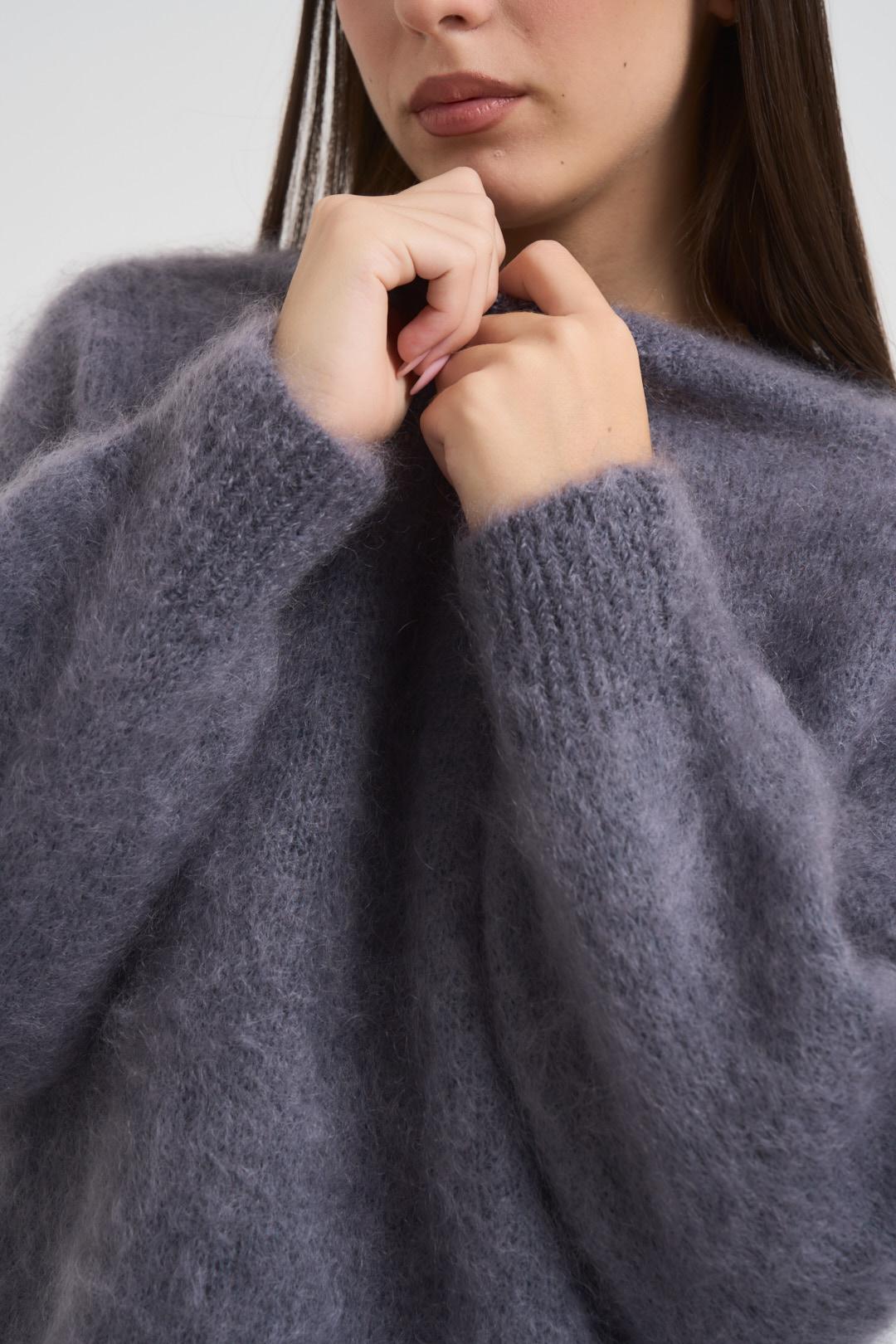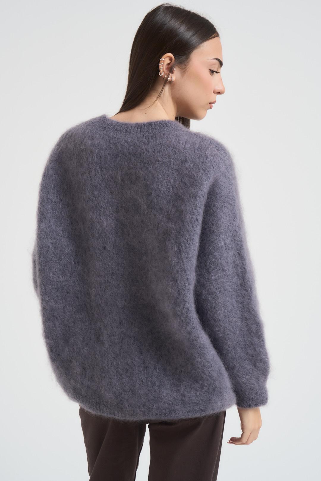 KAOS Maglione donna in misto mohair grigio. Modello girocollo. Polsini, collo e orlo a costine. Fit oversize. Composizione: 80% Mohair 18% Poliammide 2% Elastane. La modella è alta 172 cm e indossa la taglia S.