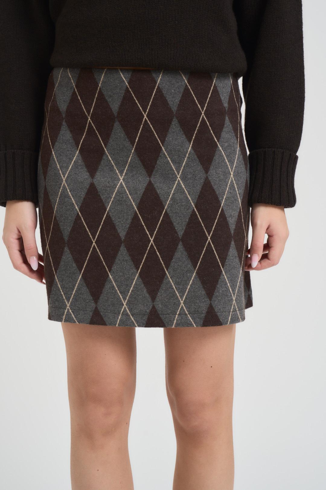 TENSIONE IN Minigonna donna a rombi marrone e grigia. Modello corto fit a matita con chiusura a zip sul retro. Composizione: 53% poliestere 44% cotone 03%elastane. La modella è alta 172 cm e indossa la taglia S.
