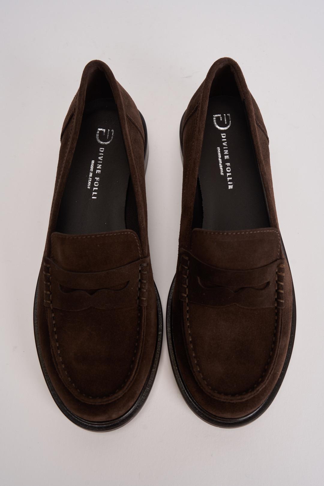 DIVINE FOLLIE Mocassino donna in suede marrone. Modello con impunture a visa, tacco basso da 2,5 cm e soletta interna in pelle con logo impresso. Calzata regolare.