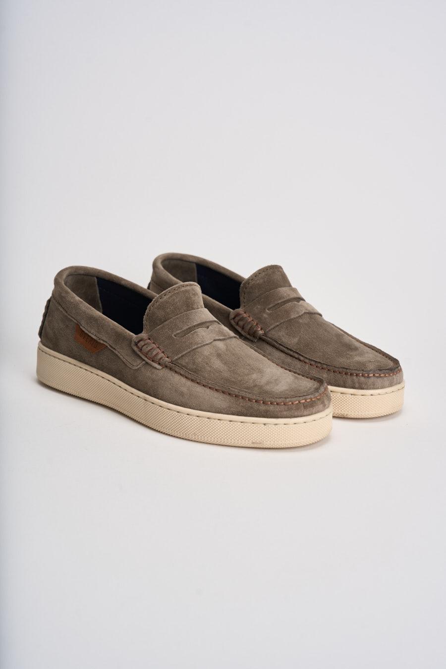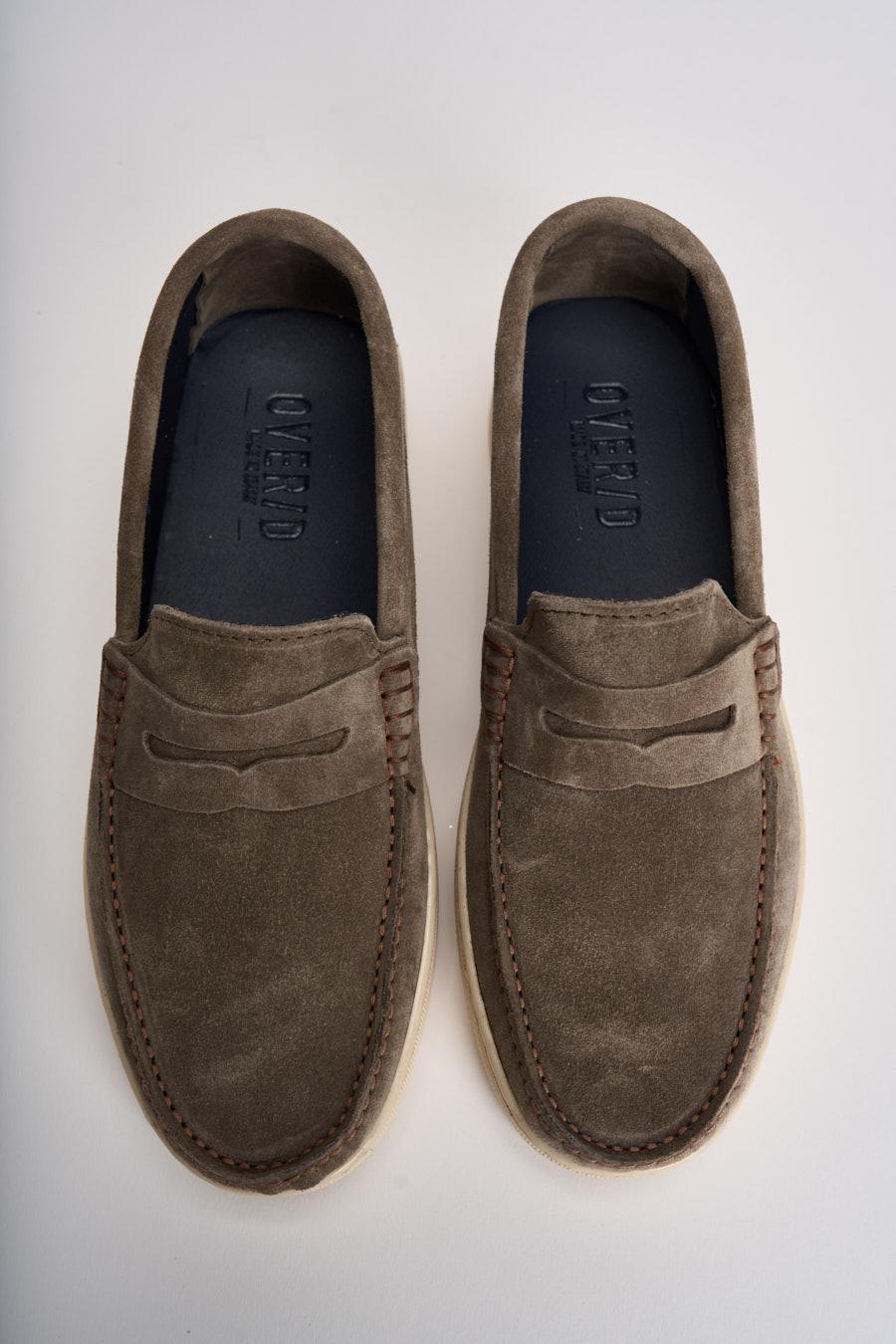OVERD Mocassino uomo in suede tortora. Modello slip-on con tomaia in pelle scamosciata e mascherina frontale classica. Cuciture a vista tono su tono lungo la punta e dettaglio logo OVERD applicato lateralmente su inserto in pelle. Interno con plantare logato. Suola platform in gomma color panna. Altezza suola: 3cm. Composizione: 100% pelle.