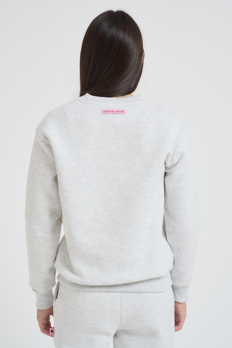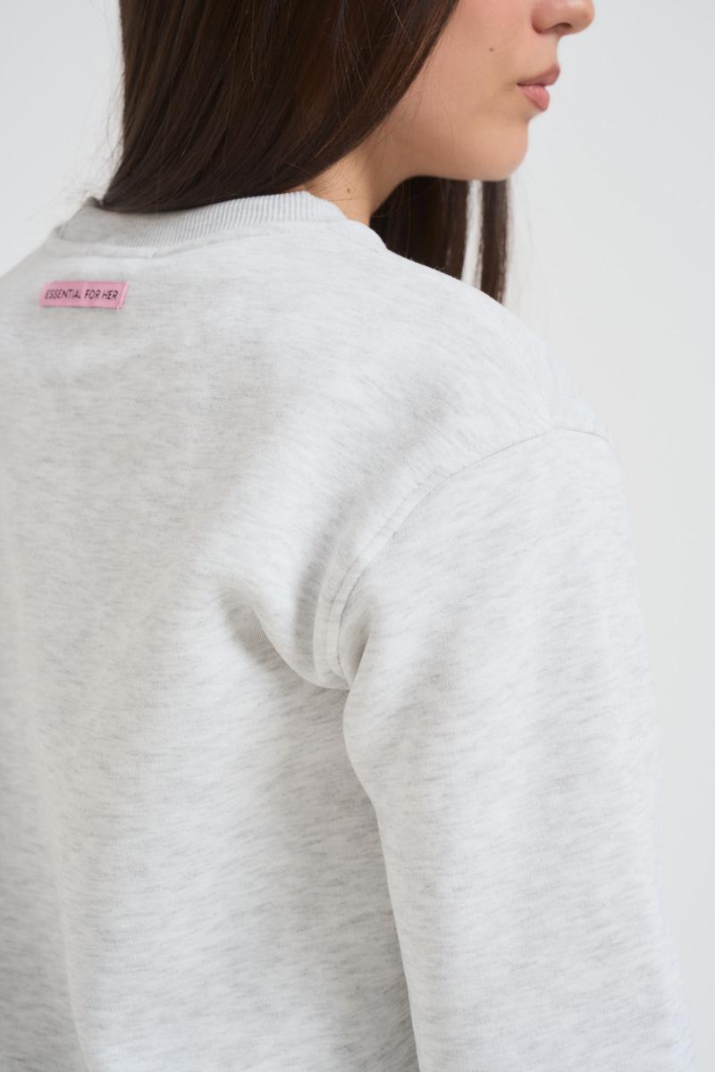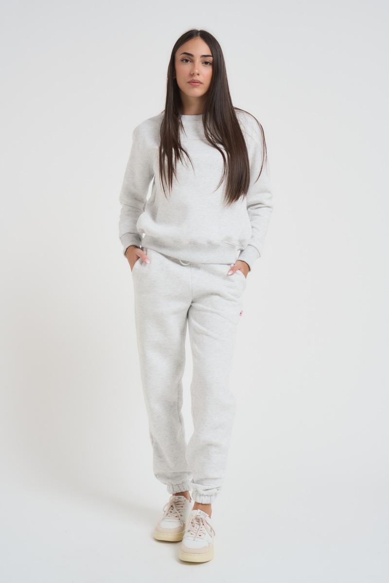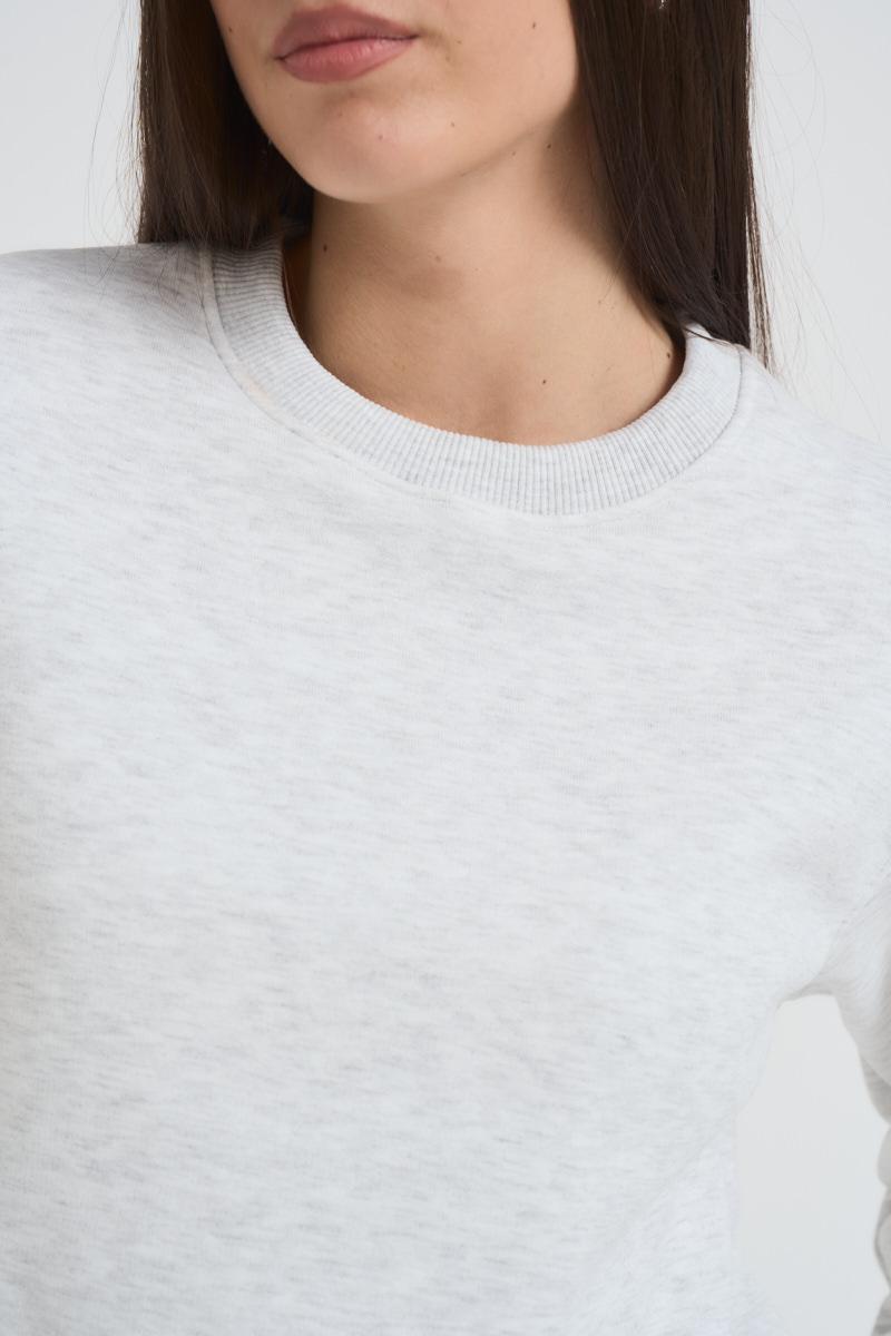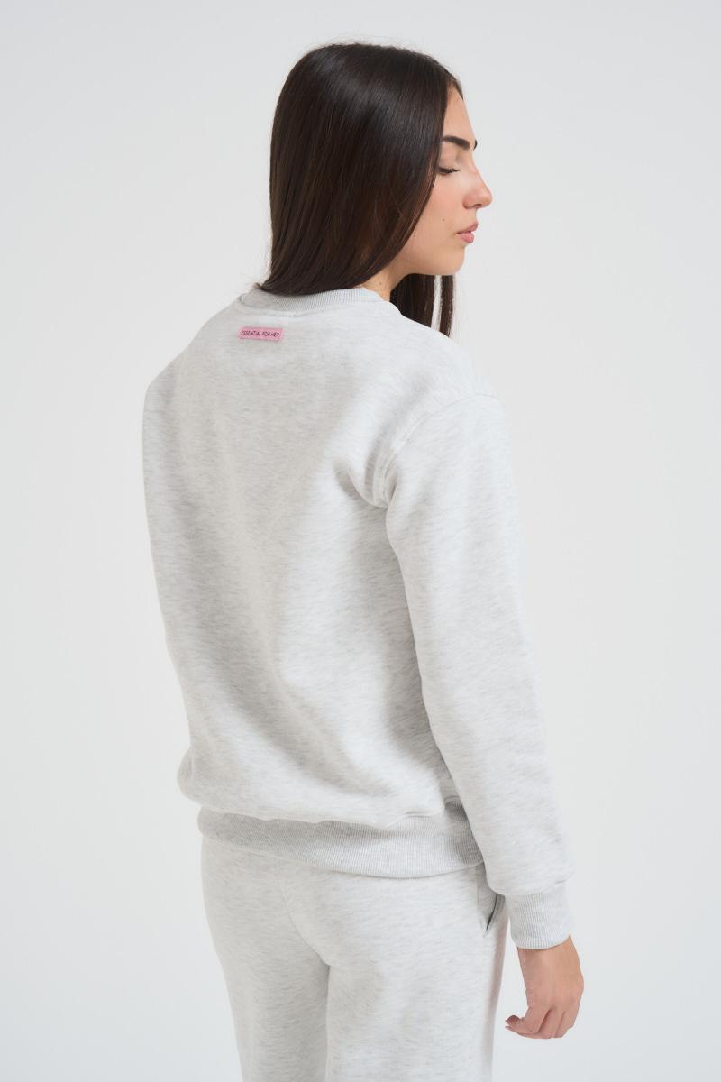 SUPERCULTURE Felpa donna girocollo grigio chiaro. Modello maniche lunghe con scritta bramnd in bianco sulla manica. Vestibilità regular. Composizione: 65% cotone organico 35% Poliestere. La modella è alta 172cm e indossa la tg S.