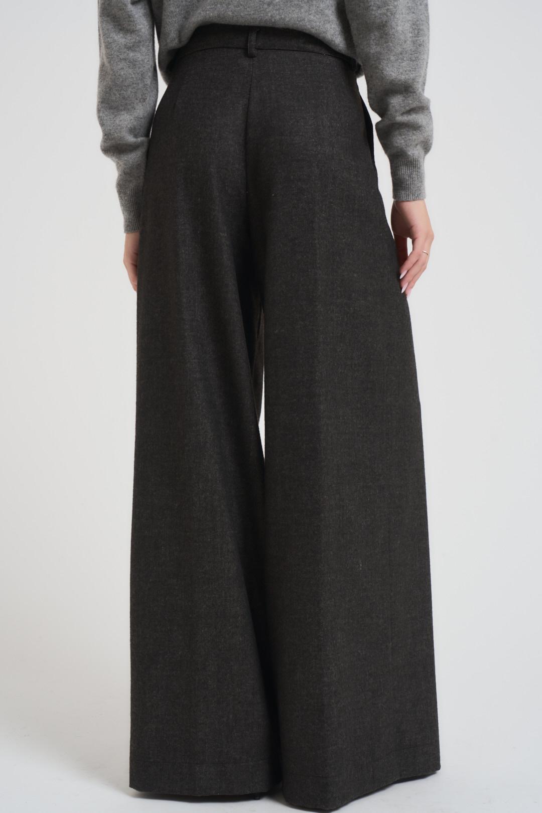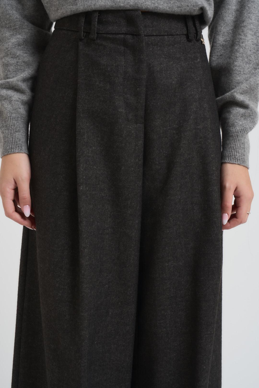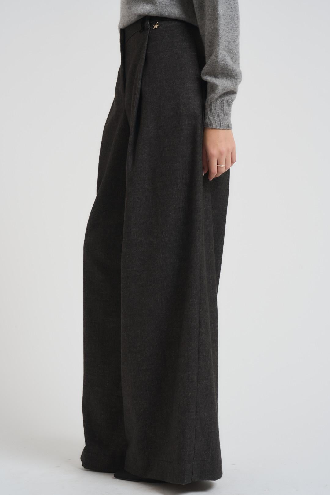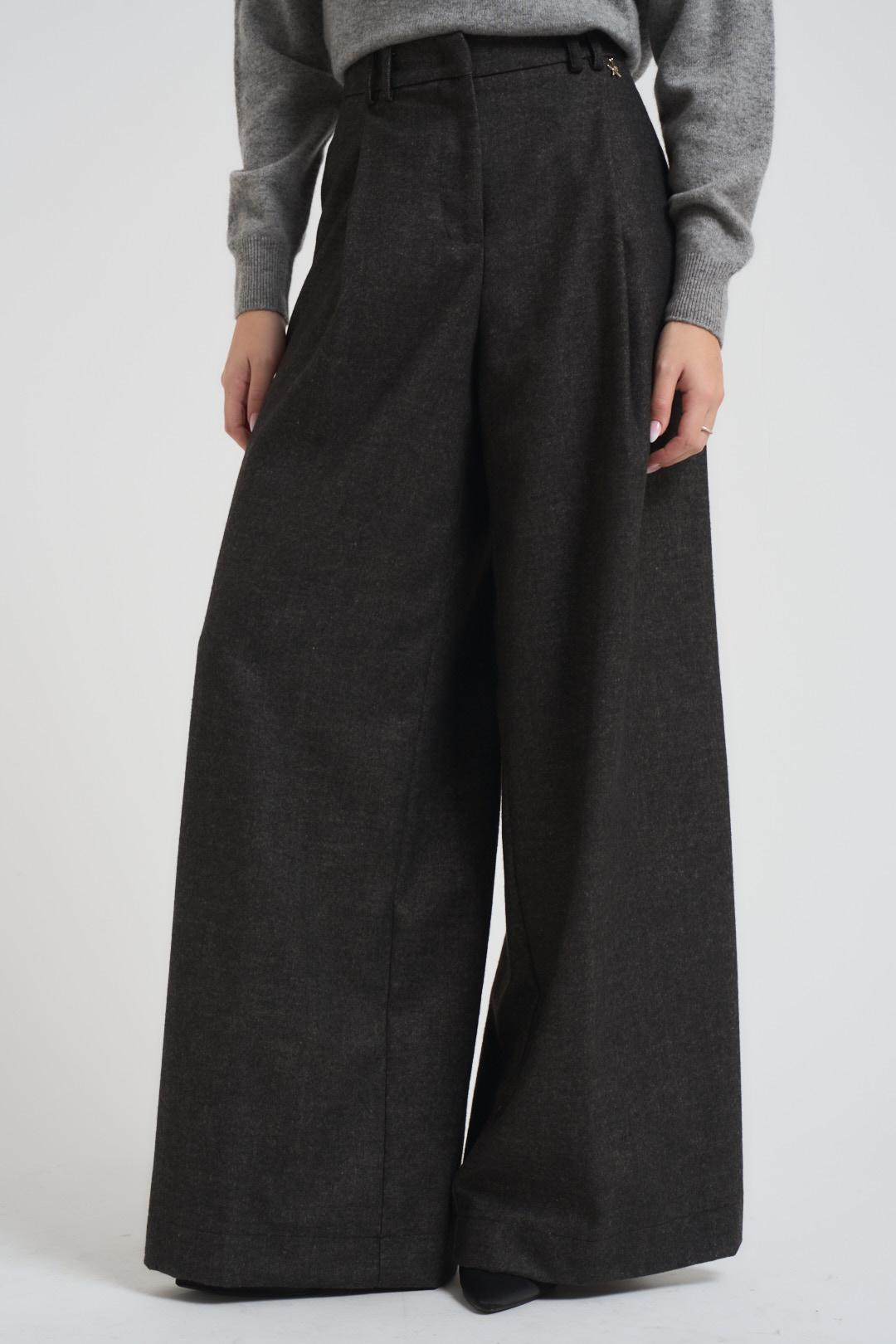SOUVENIR CLUBBING Pantalone donna a palazzo antracite. Modello ampio con piences sul davanti. Vita medio alta. Chiusura frontale con zip e gancio. Passanti in vita. Due tasche laterali. Composizione: 63% poliestere, 34% viscosa, 3% elastane. La modella è alta 172 cm e indossa la taglia S.