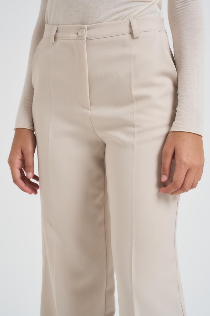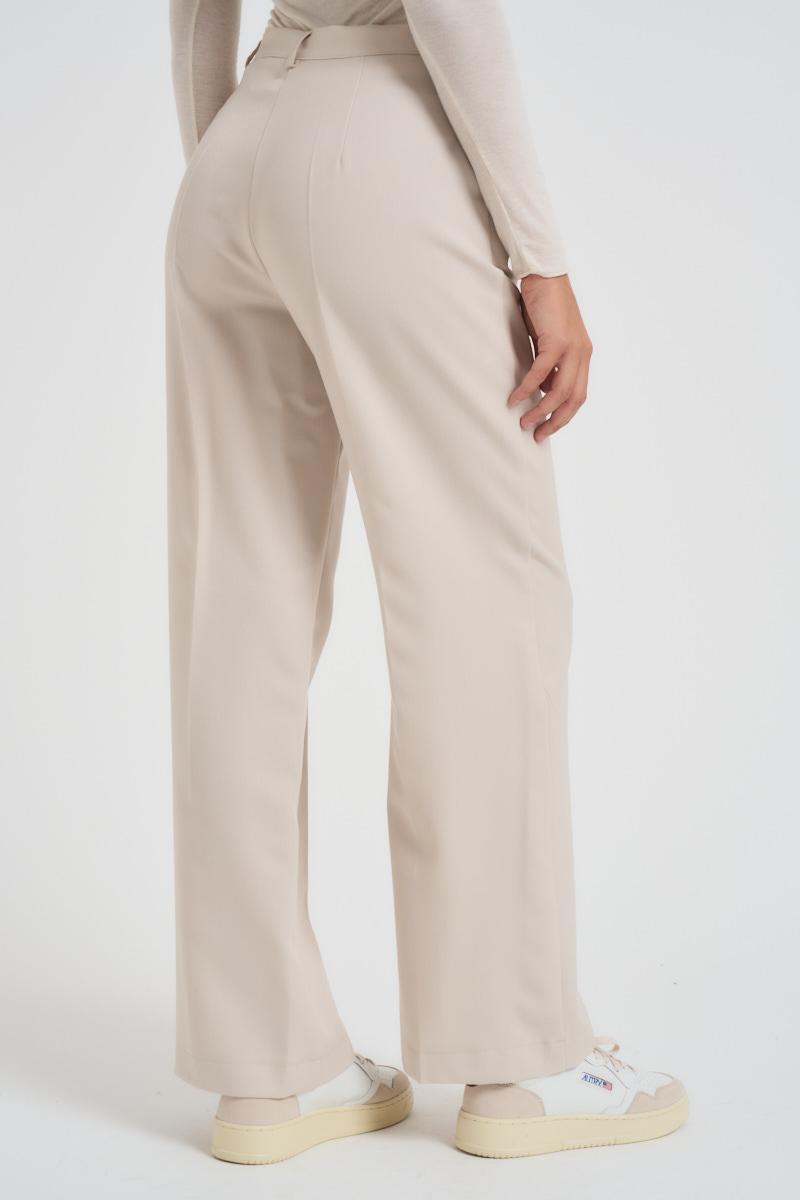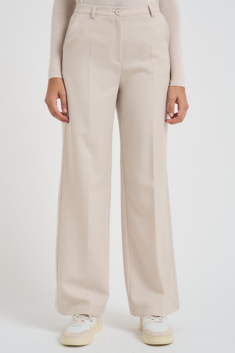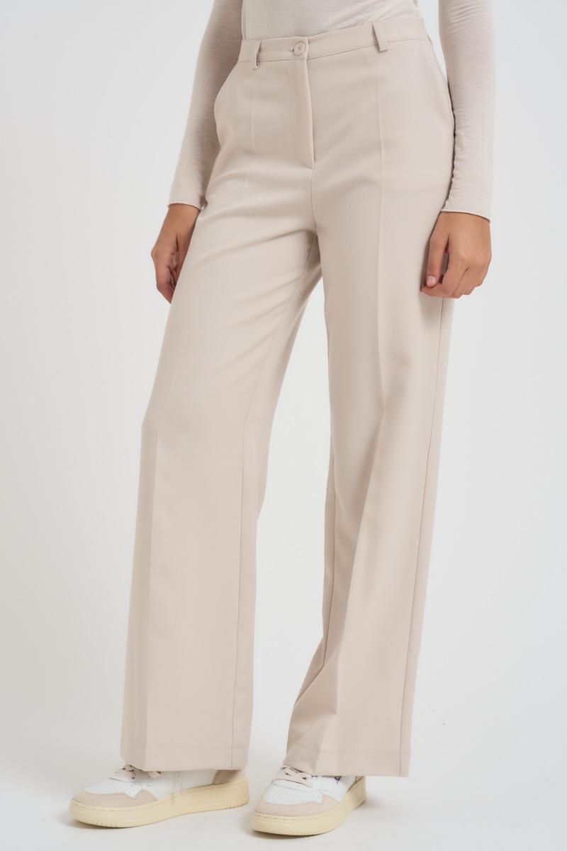 LOKITA MILANO Pantalone donna a palazzo avorio. Modello con due tasche, chiusura con zip e bottone. Composizione: 100% poliestere. La modella è alta 172 cm e indossa la taglia S.
