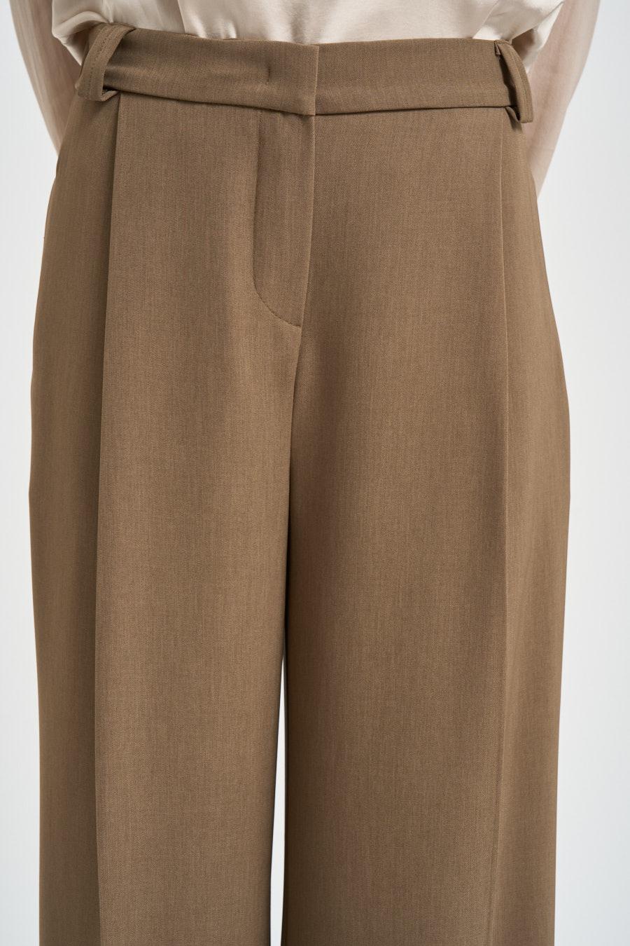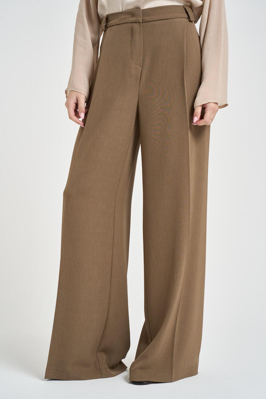 MARYLEY Pantalone donna a palazzo beige. Modello dalla vestibilità morbida e gamba larga. Doppie pieghe. Chiusura frontale con cerniera e gancetto. Cintura elasticizzata. Tasca a filo sul retro. Composizione: 97% poliestere, 3% elastane. La modella è alta 172 cm e indossa la taglia S.