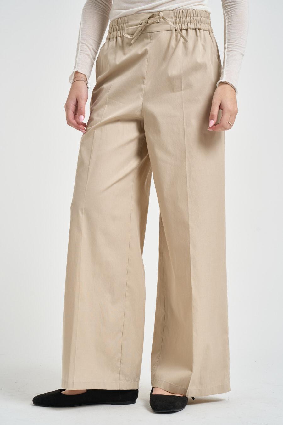 EMME Pantalone donna a palazzo beige. Modello in tessuto leggero e fluido, vita alta con fascia elasticizzata e coulisse regolabile tono su tono che assicura comfort e vestibilità personalizzata. Gamba ampia e dritta con linea morbida che scivola lungo la silhouette, valorizzata da piega centrale frontale per un effetto elegante e slanciato. Composizione: 100% cotone. La modella è alta 172cm e indossa la taglia 40.