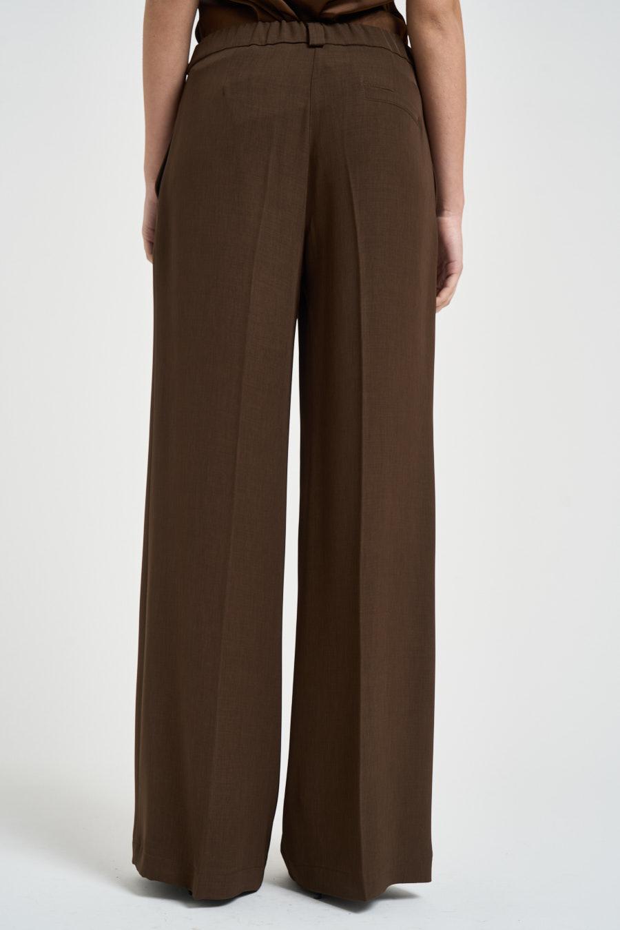MARYLEY Pantalone donna a palazzo cioccolato. Modello dalla vestibilità morbida e gamba larga. Doppie pieghe. Chiusura frontale con cerniera e gancetto. Cintura elasticizzata. Tasca a filo sul retro. Composizione: 97% poliestere, 3% elastane. La modella è alta 172 cm e indossa la taglia S.