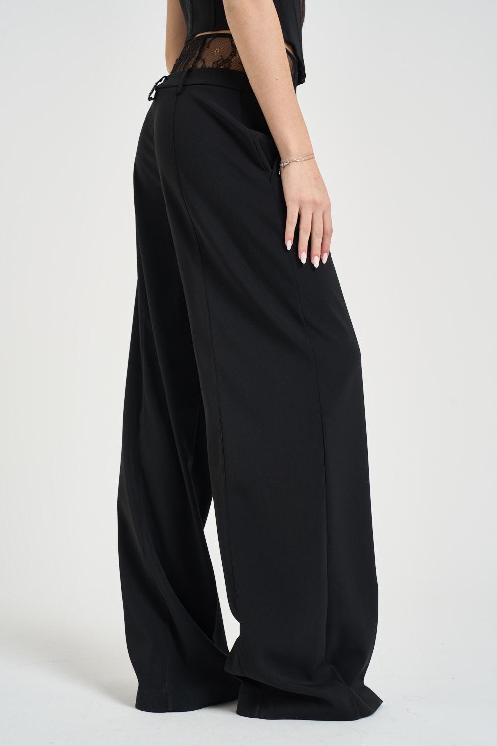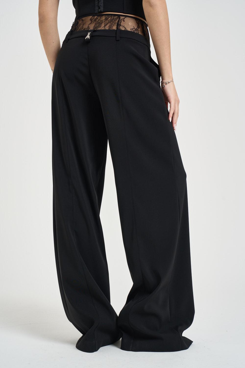 PATRIZIA PEPE Pantalone donna a palazzo con pizzo nero. Modello a vita alta con linea ampia e fluida, caratterizzato da una silhouette elegante e sartoriale. Chiusura frontale con zip invisibile e bottone interno. Tasche laterali alla francese e passanti per cintura. Dettaglio raffinato in pizzo trasparente in vita sul retro, che aggiunge un tocco femminile e sensuale al capo. Presente logo iconico Fly applicato sul retro della cintura. Composizione: 96% poliestere, 4% elastan. La modella è alta 172cm e indossa la taglia 40.