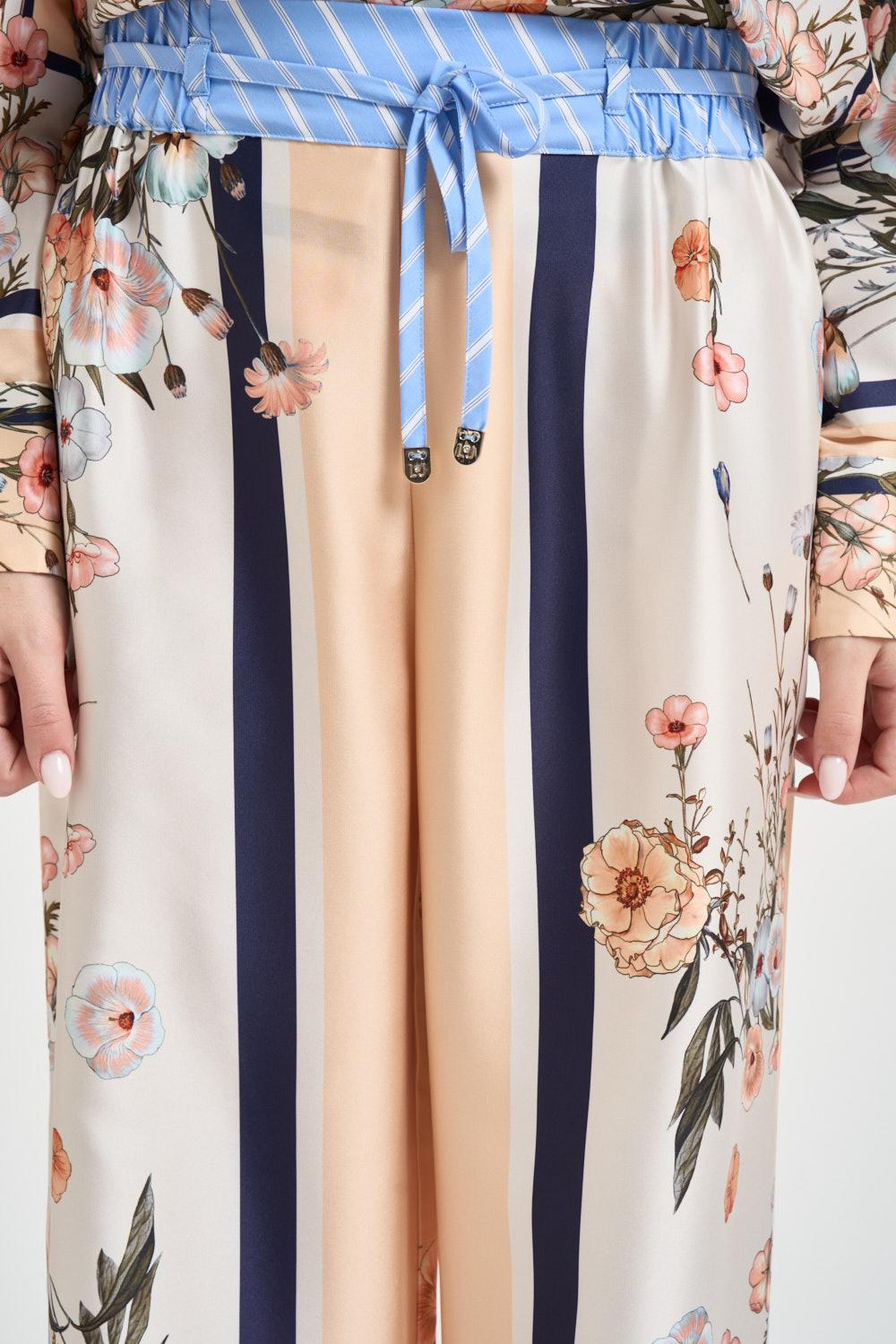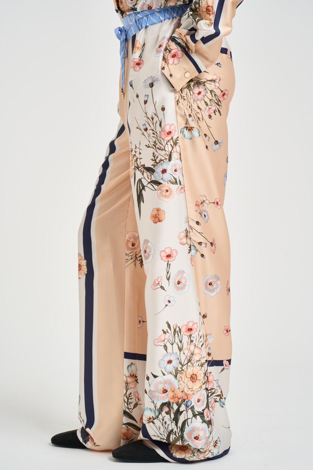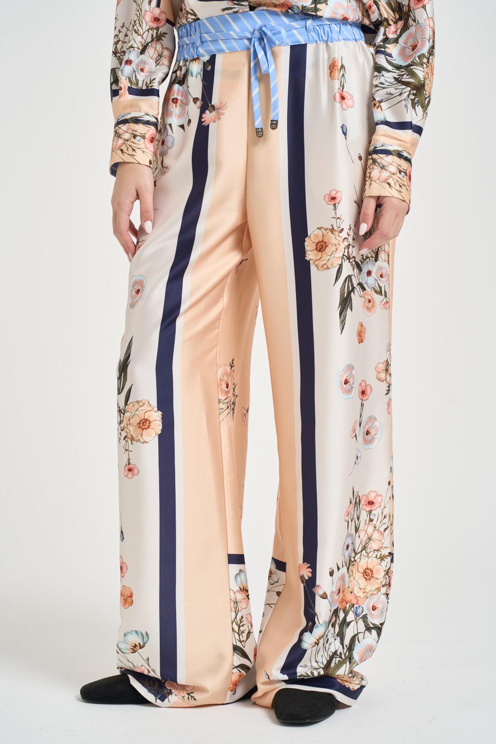 LIU JO Pantalone donna a palazzo con stampa floreale. Modello multicolor su fondo nei toni del pesca e avorio, a vita alta con elastico in vita e coulisse regolabile in tessuto a righe a contrasto. Gamba ampia e fluida, due tasche laterali alla francese e tasca applicata sul retro in tessuto rigato. Piccolo logo Liu Jo integrato nella fantasia, finiture con fondo dritto. Composizione: 100% poliestere. La modella è alta 172cm e indossa la taglia 40.