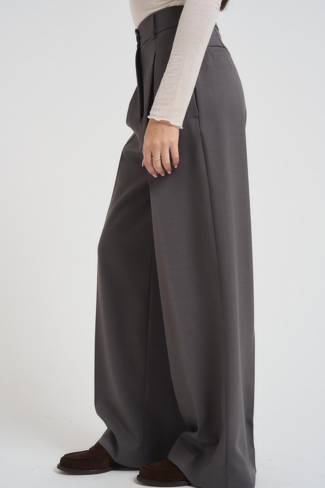 VICOLO Pantalone donna a palazzo grigio. Modello con pinces sul davanti, chiusura con zip e bottone, due tasche laterali. Composizione: 97% poliestere 3% elastane. La modella è alta 172 cm e indossa la taglia S.