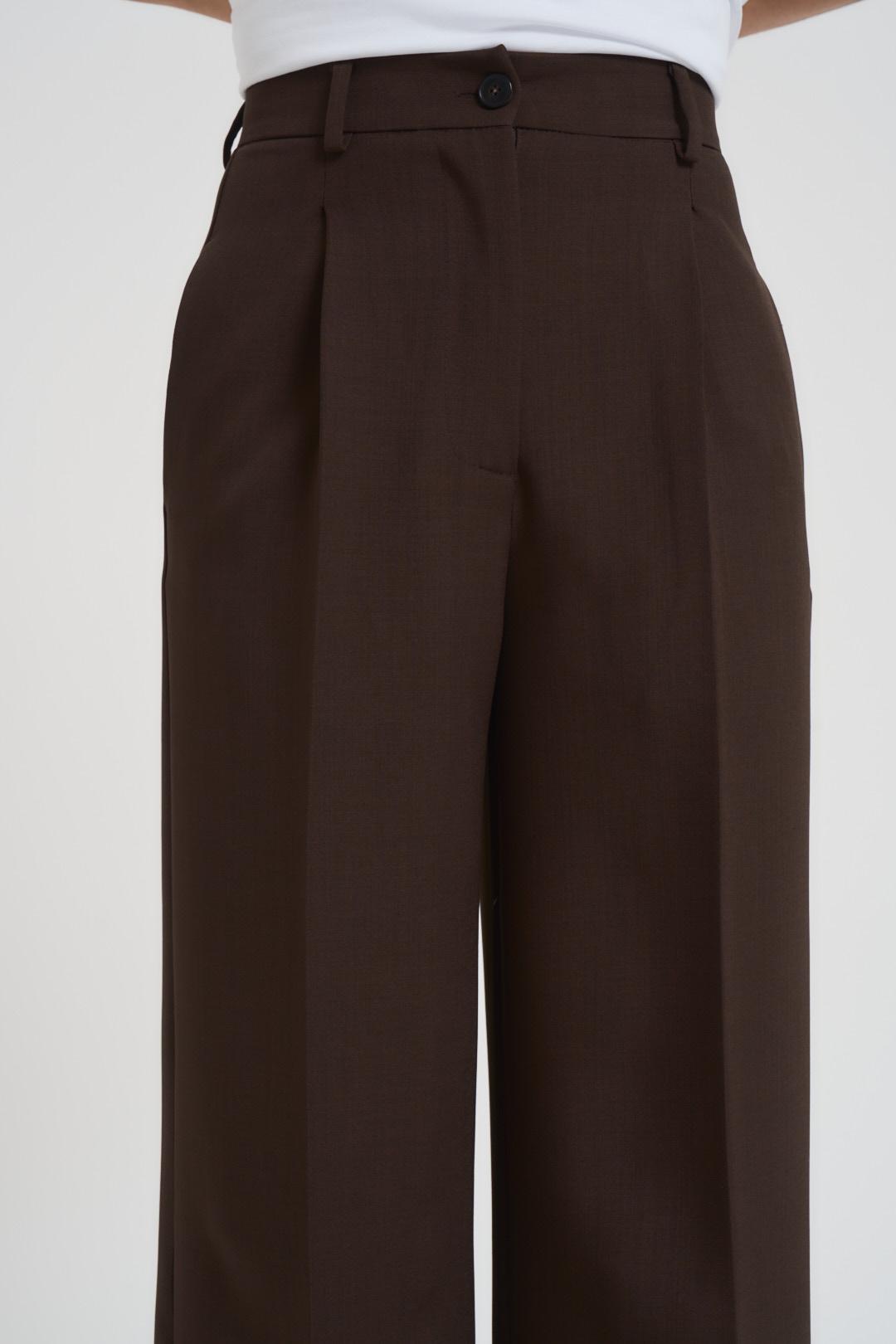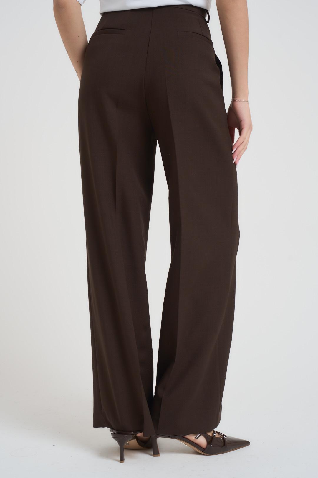 VICOLO Pantalone donna a palazzo marrone. Modello con pinces sul davanti, chiusura con zip e bottone, due tasche laterali. Composizione: 97% poliestere 3% elastane. La modella è alta 172 cm e indossa la taglia S.