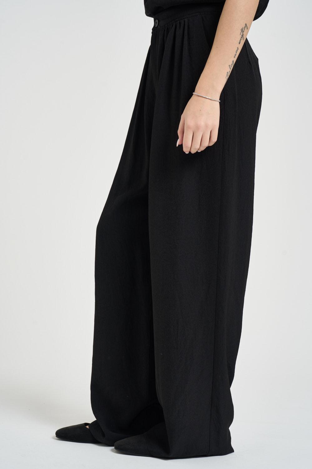 ELEH Pantalone donna a palazzo nero. Modello gamba larga con pinces sul davanti, chiusura con zip e bottone. Composizione: 60%acido acetico 40% poliestere. La modella è alta 172 cm e indossa la taglia 40.