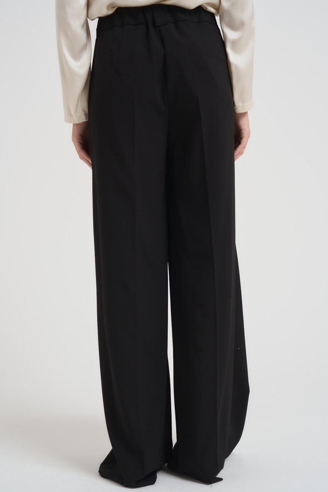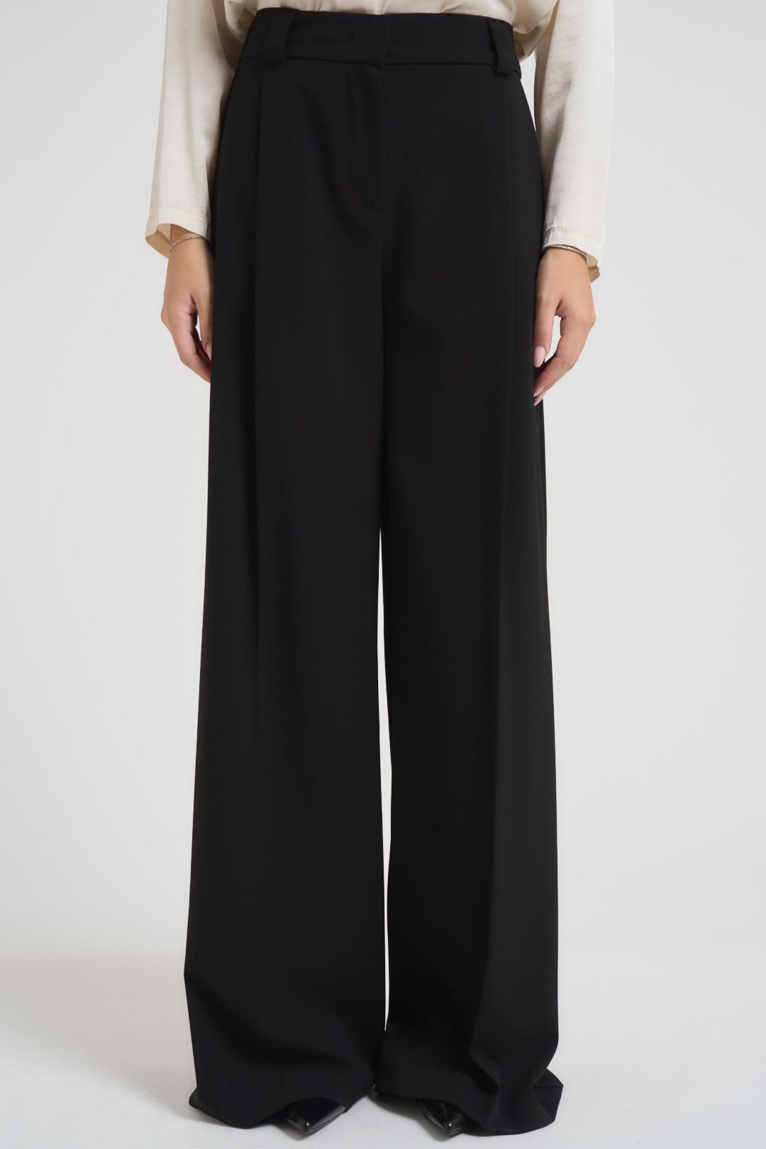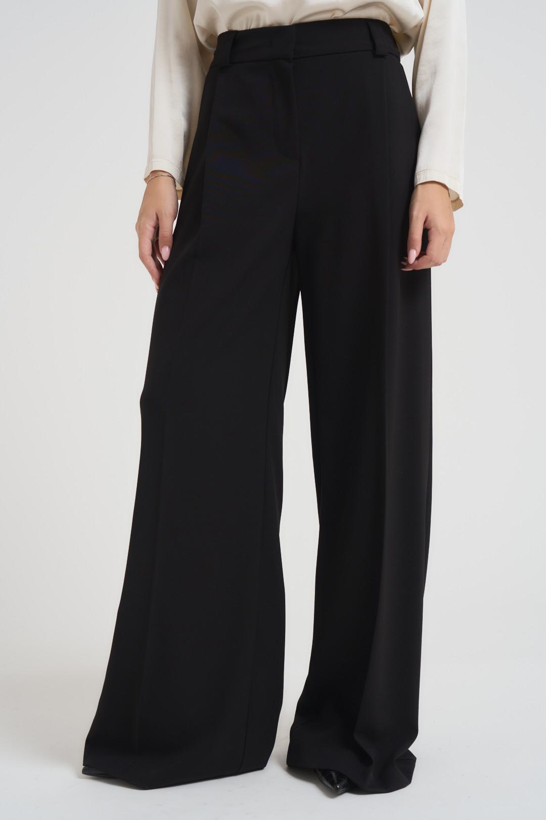 MARYLEY Pantalone donna a palazzo nero. Modello vita alta, gamba larga, due tasche a filetto, elastico sul retro. Chiusura con zip e bottone. Composizione: 90% poliestere, 10% elastane. La modella è alta 172 cm e indossa la taglia S.