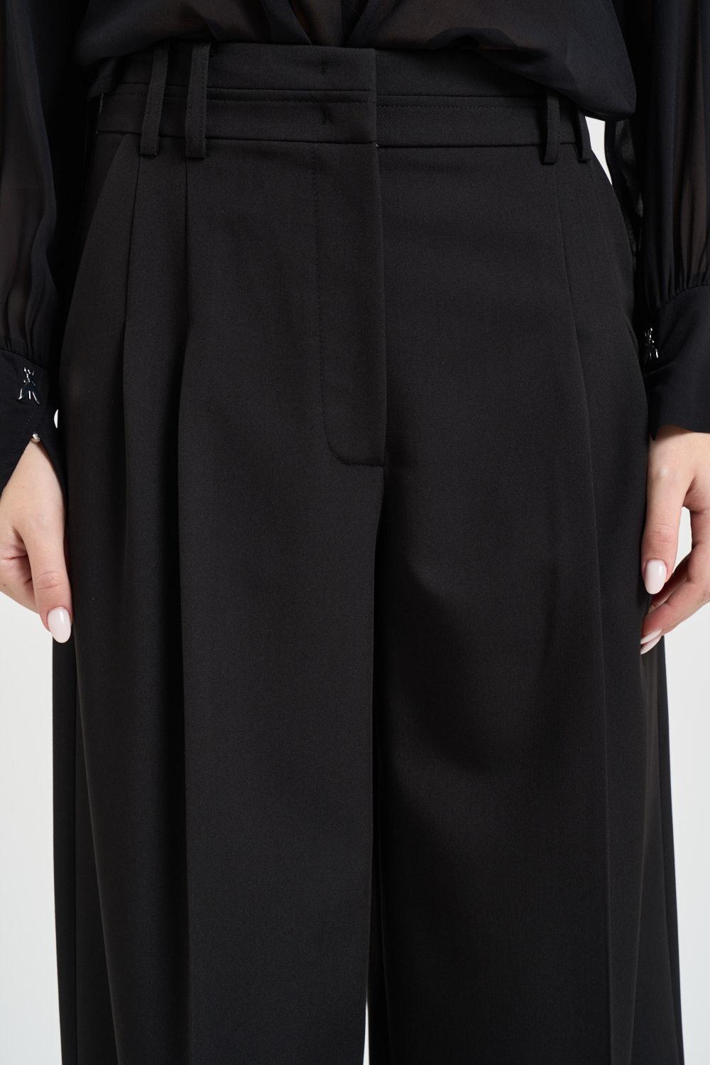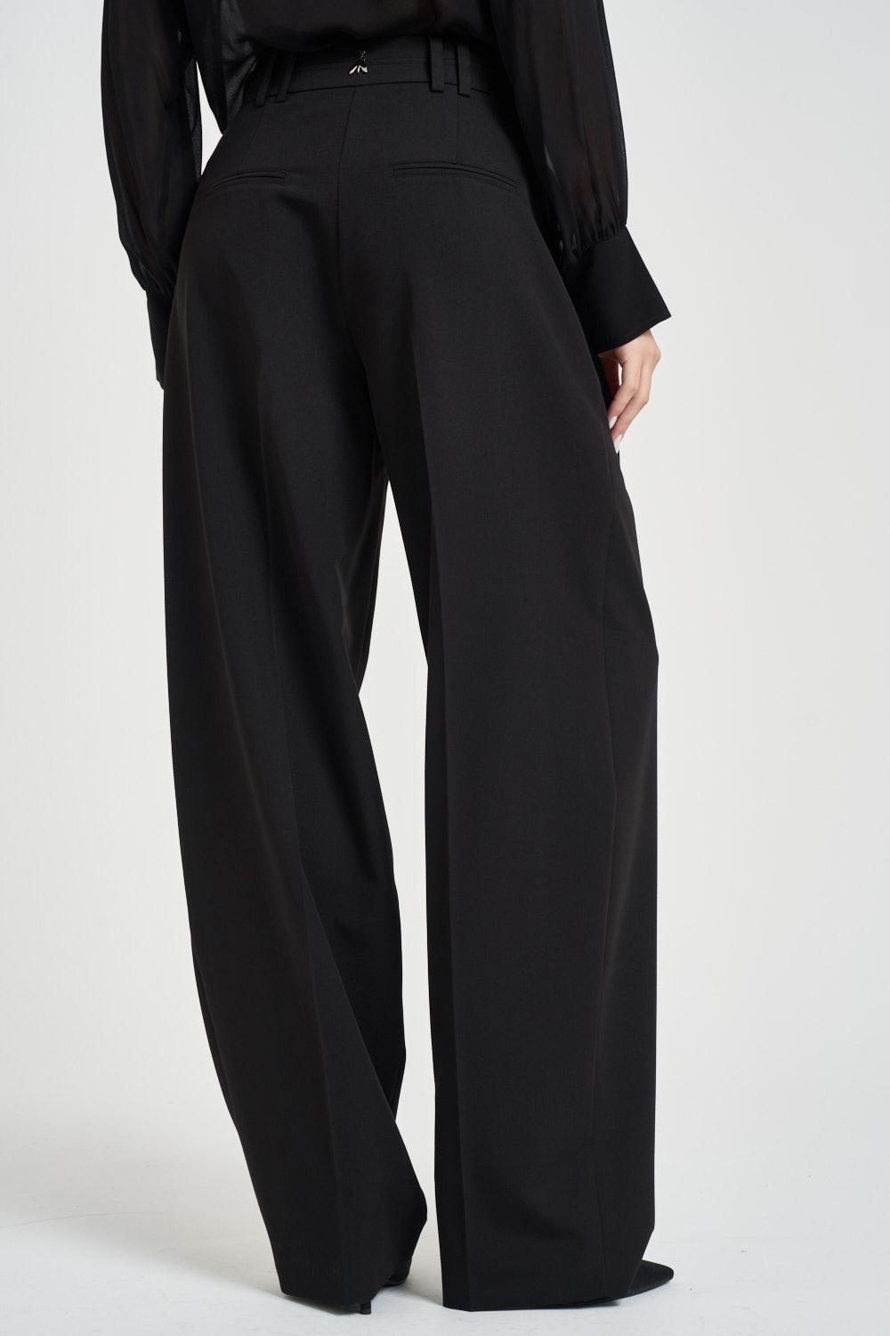 PATRIZIA PEPE Pantalone donna a palazzo nero. Modello fluido. Chiusura frontale con cerniera e gancetti. Passanti in vita. Doppie pinces. Pieghe. Due tasche laterali. Due tasche a filo sul retro. Composizione: 72% Poliestere, 23% Viscosa, 5%Elastane. La modella è alta 172 cm e indossa la taglia 40.