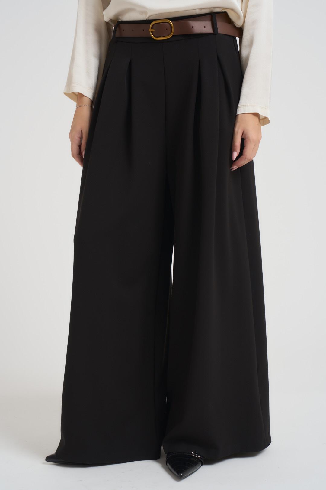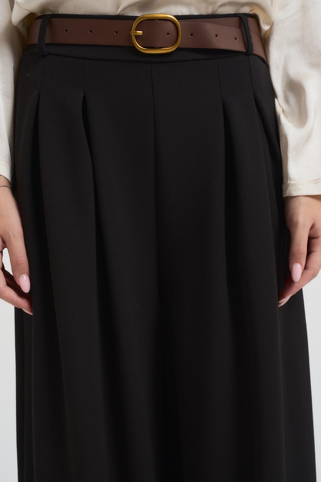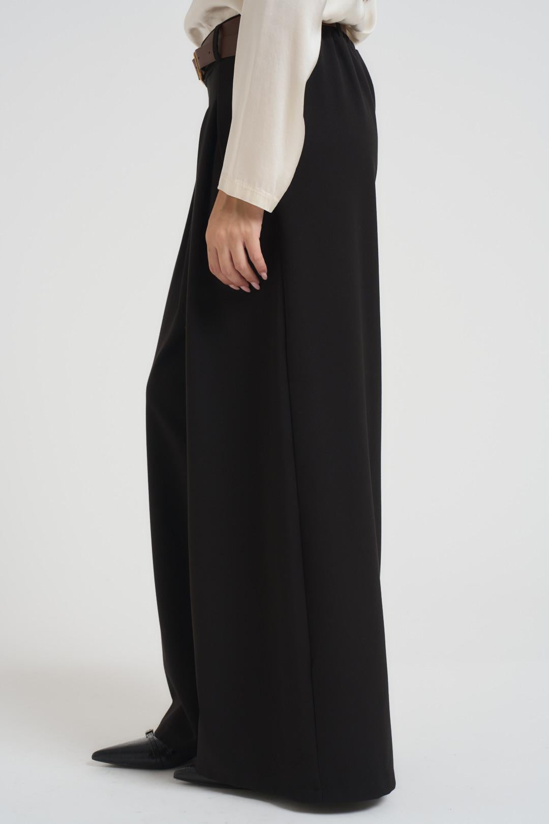SUSY MIX Pantalone donna a palazzo nero. Modello a vita alta, gamba larga, cintura in ecopelle marrone, due tasche laterali. Composizione: 100% poliestere. La modella è alta 172 cm e indossa la taglia S.