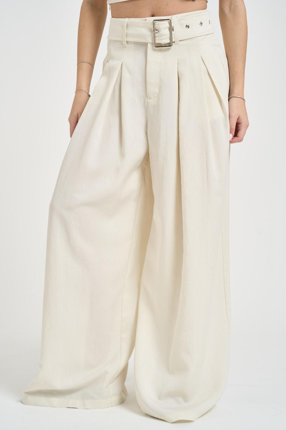 ELEH Pantalone donna a palazzo panna. Modello a vita alta con pinces frontali. Chiusura con zip nascosta e cintura coordinata in tessuto con fibbia metallica regolabile. Tasche laterali alla francese e tasca a filetto sul retro. Linea ampia e fluida. Composizione: 100% viscosa. La modella è alta 172 cm e indossa la taglia 40.