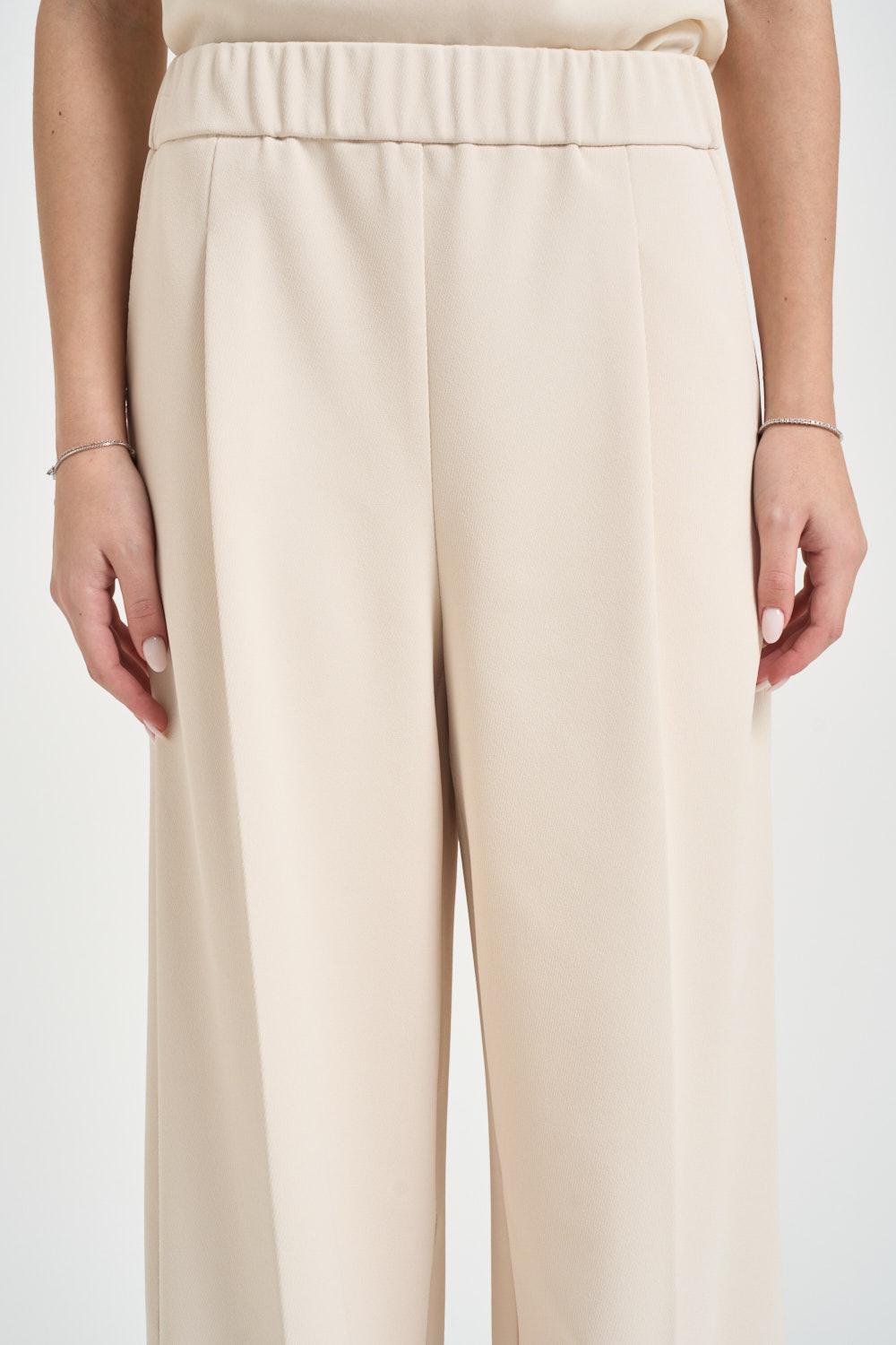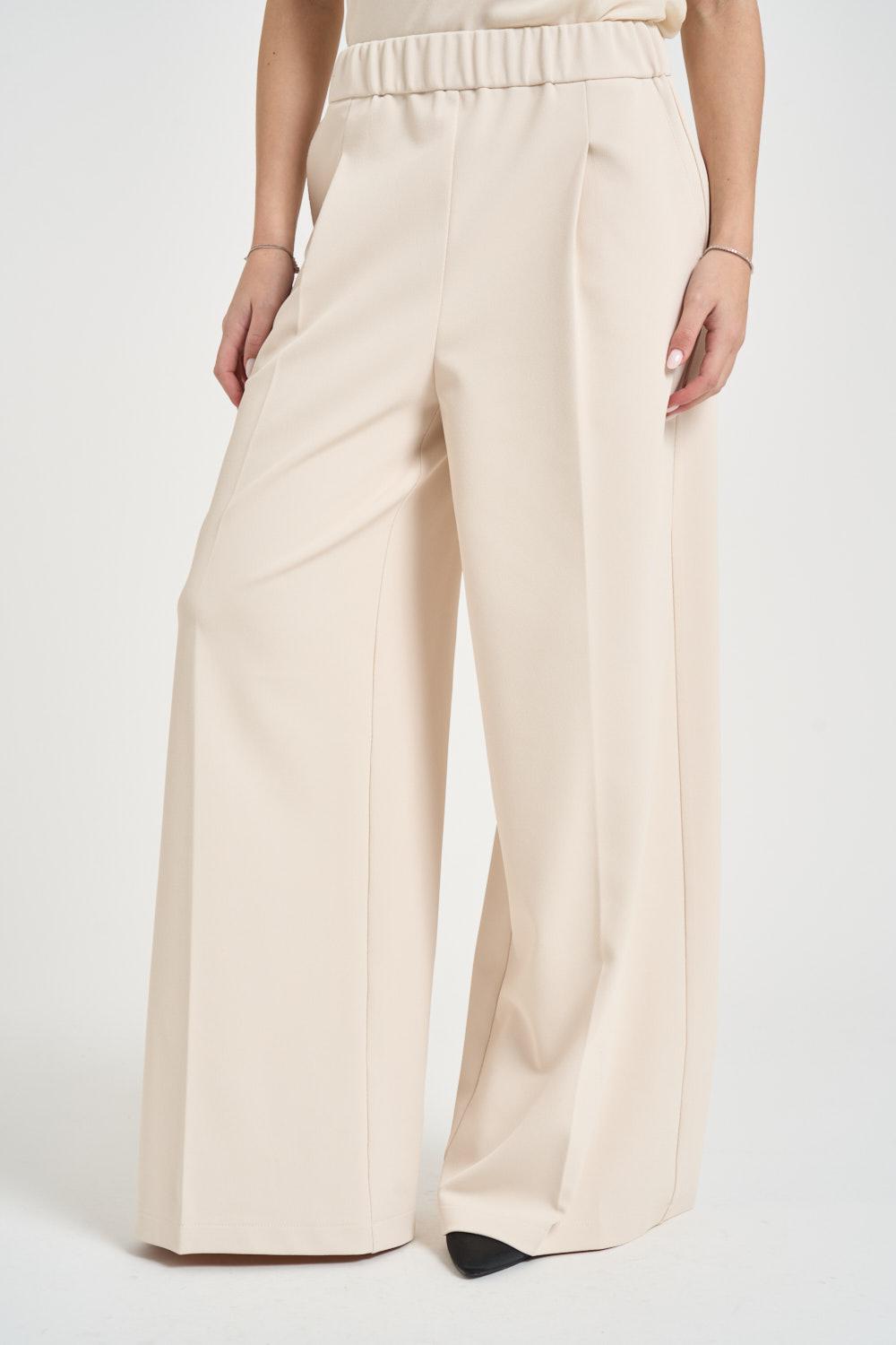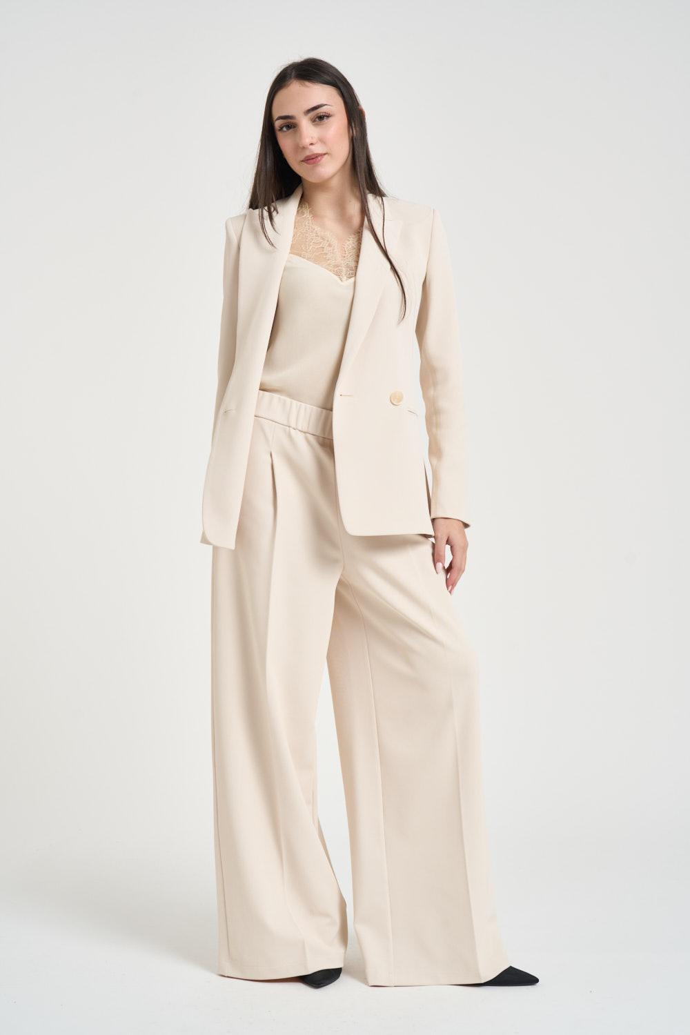 PATRIZIA PEPE Pantalone donna a palazzo panna. Modello con vestibilità palazzo, vita regolare e rivetto Fly su passante. Composizione: 3% Elastan 97% Poliestere. La modella è alta 176cm e indossa la taglia 40.