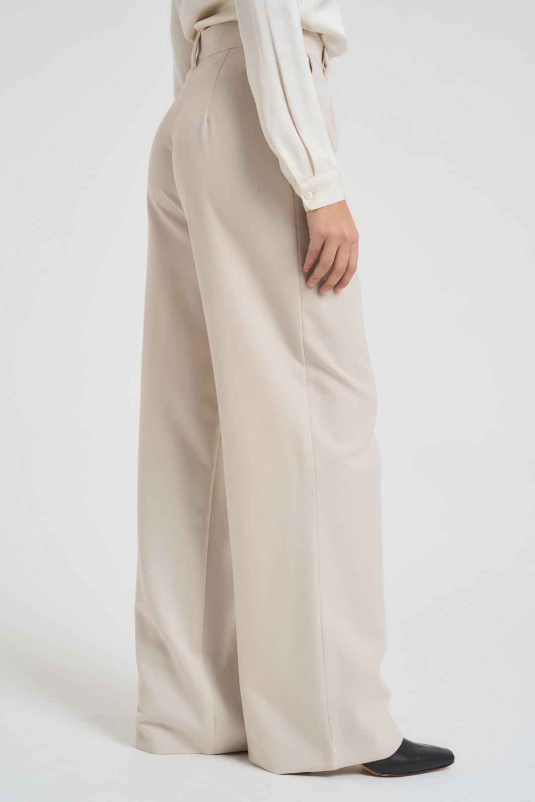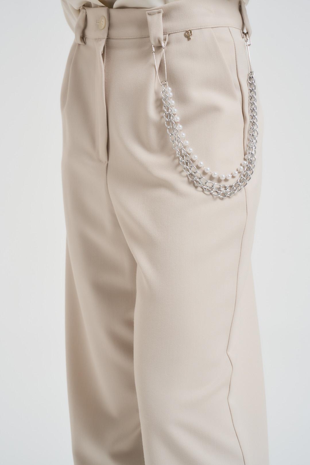 PHILIA Pantalone donna a palazzo panna. Modello con pinces. Chiusura frontale con zip e bottone. Passanti in vita. Catena rimovibile in vita. Composizione: 96% poliestere, 4% elastan. La modella è alta 176 cm e indossa la taglia S.