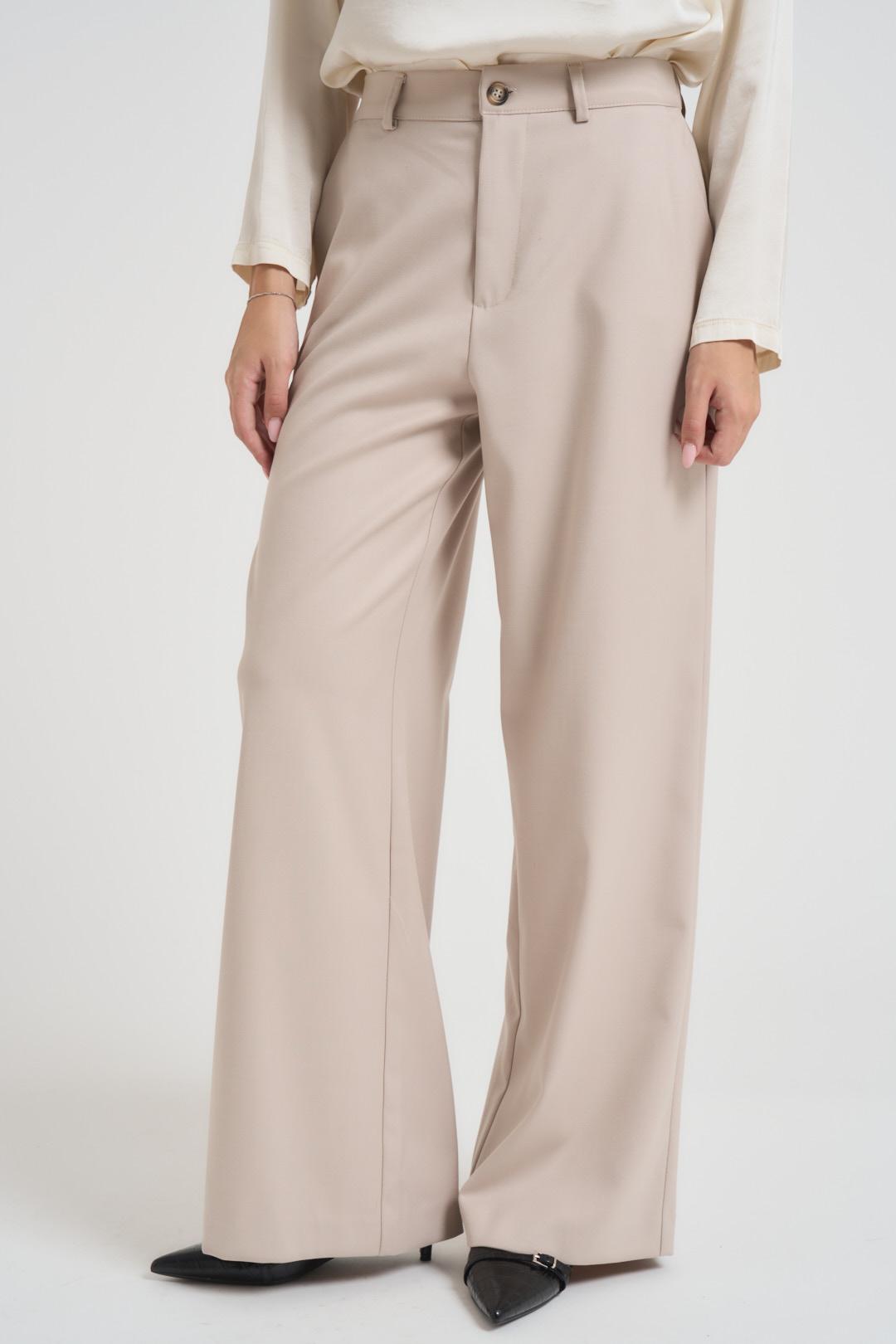 SUSY MIX Pantalone donna a palazzo panna. Modello gamba dritta con elastico sul retro, due tasche a filetto laterali. Composizione: 96% poliestere 4% elastane. La modella è alta 172 cm e indossa la taglia S.