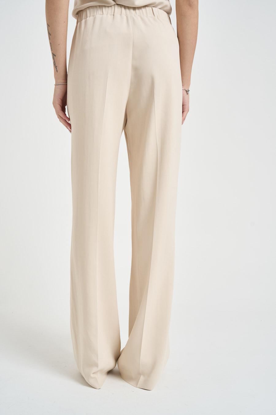 SEVENTY Pantalone donna a palazzo panna. Modello a gamba ampia con piega frontale, vita elasticizzata sul retro e chiusura frontale con bottone. Linea fluida ed elegante, tasche laterali a filo. Composizione: 96%viscosa 4%elastane. La modella è alta 172cm e indossa la taglia 40.