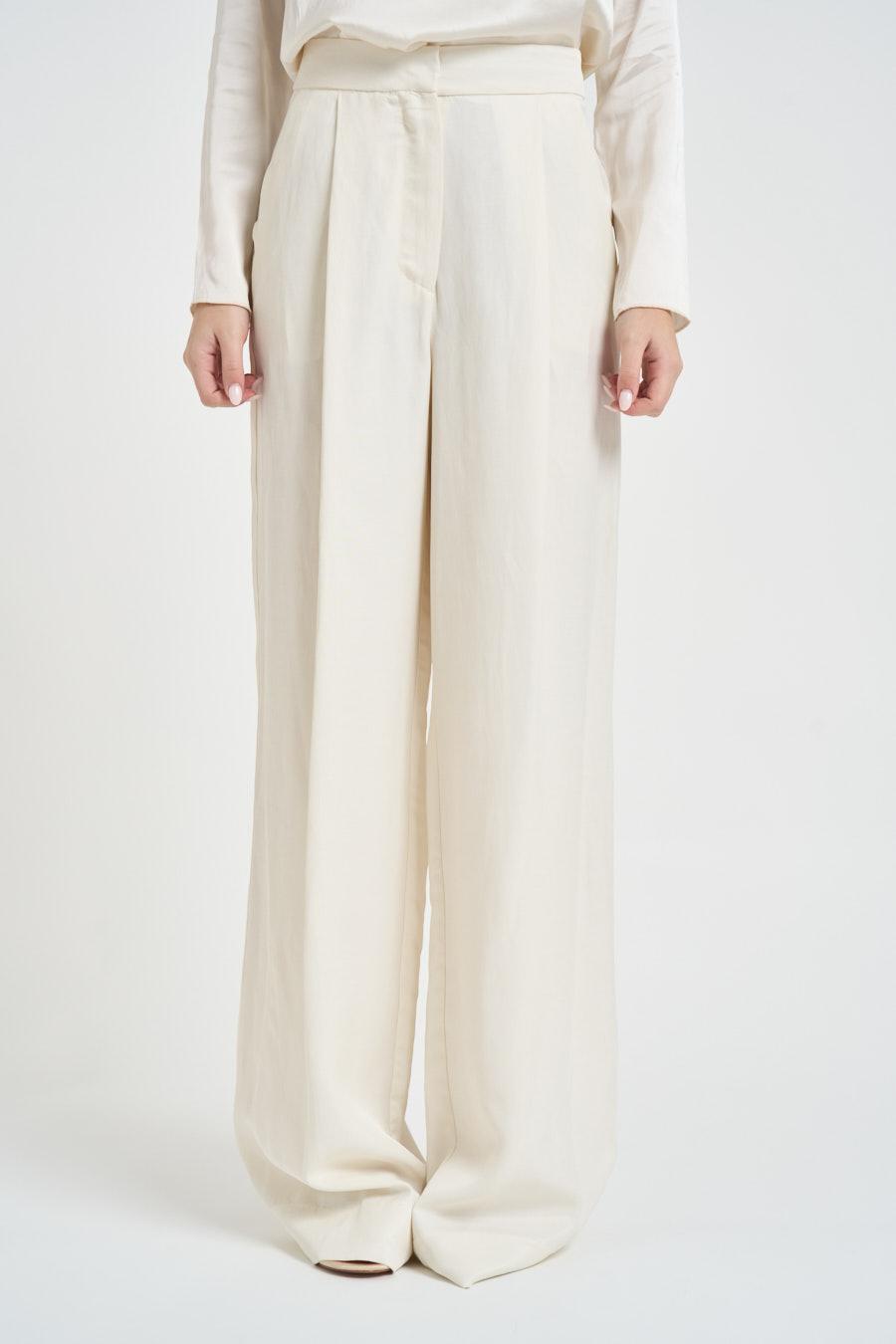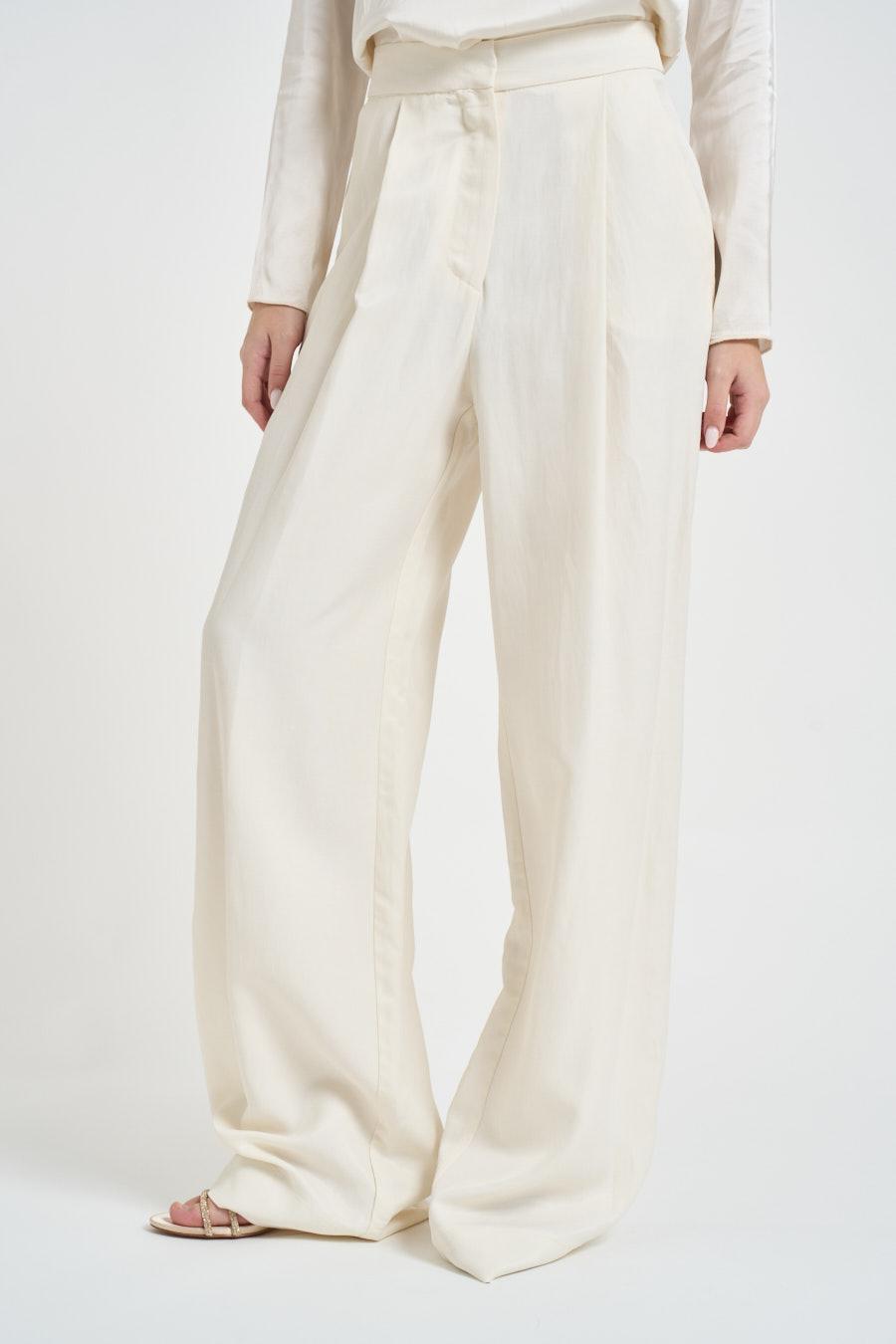KAOS Pantalone donna a palazzo panna. Modello a gamba ampia con linea fluida ed elegante, caratterizzato da piega frontale che slancia la silhouette. Chiusura frontale con zip e gancio nascosto, passanti per cintura e tasche laterali a filo. Composizione: 77% viscosa 23%lino. La modella è alta 172cm e indossa la taglia 38.