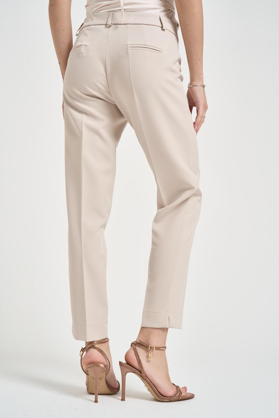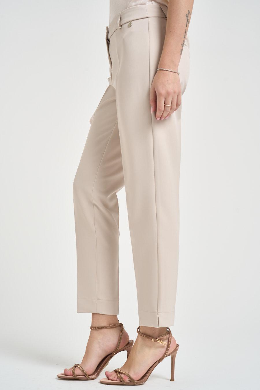 MARYLEY Pantalone donna a sigaretta sabbia. Modello dritto. Chiusura frontale con cerniera e bottone. Passanti in vita. Pinces. Tasche a filo sul retro. Composizione: 90% poliestere, 10% elastane. La modella è alta 172 cm e indossa la taglia S.