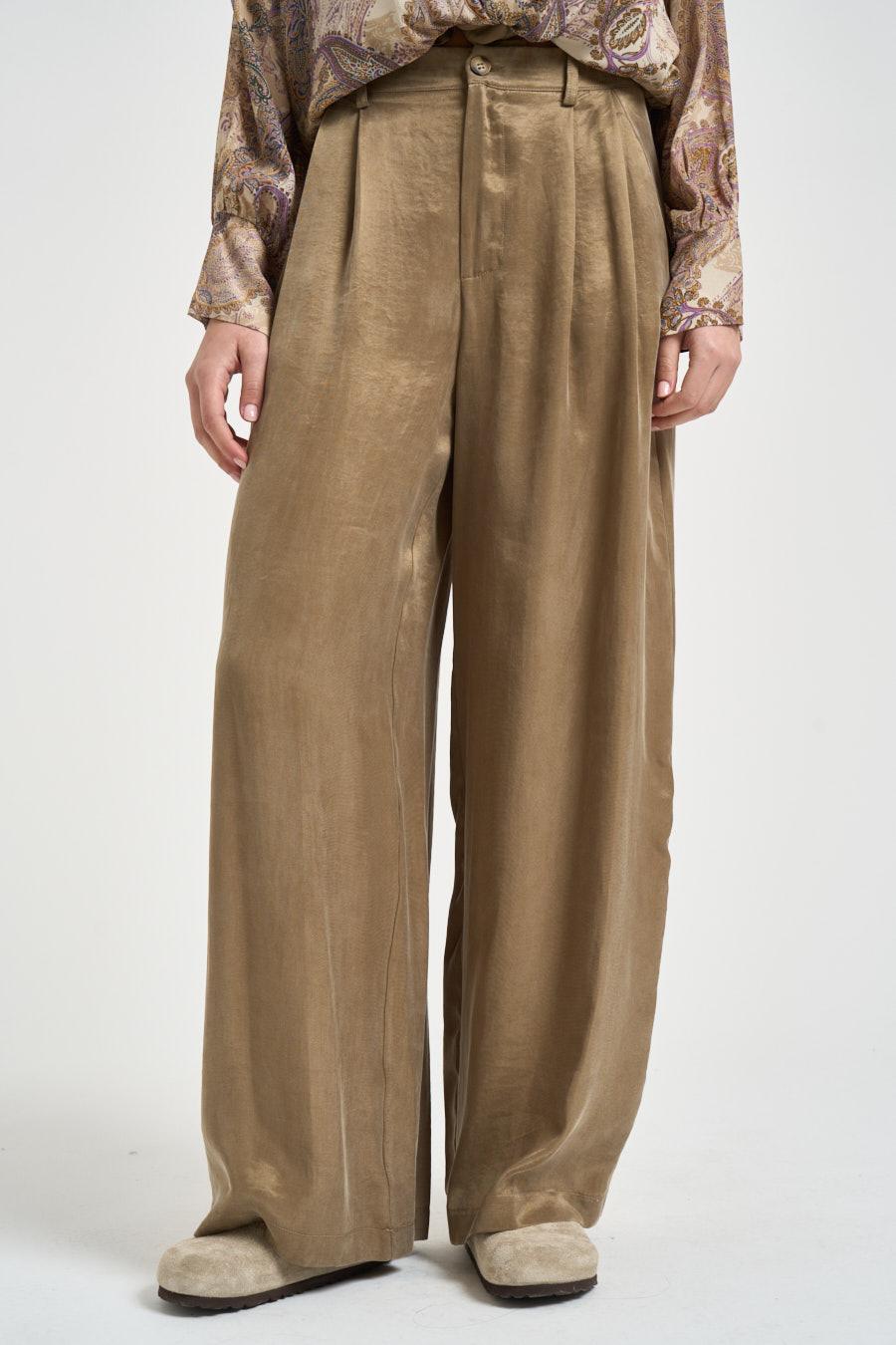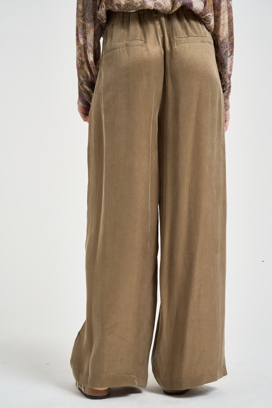 DIXIE Pantalone donna ampio cammello. Modello a vita alta con chiusura frontale con bottone e zip nascosta, caratterizzato da pinces sul davanti che donano struttura e movimento alla silhouette. Linea palazzo con gamba larga e fluida, realizzata in tessuto leggermente luminoso dalleffetto satinato che valorizza il capo con uneleganza contemporanea. Tasche laterali e tasche posteriori a filetto. Composizione: 100% viscosa. La modella è alta 176cm e indossa la taglia S.