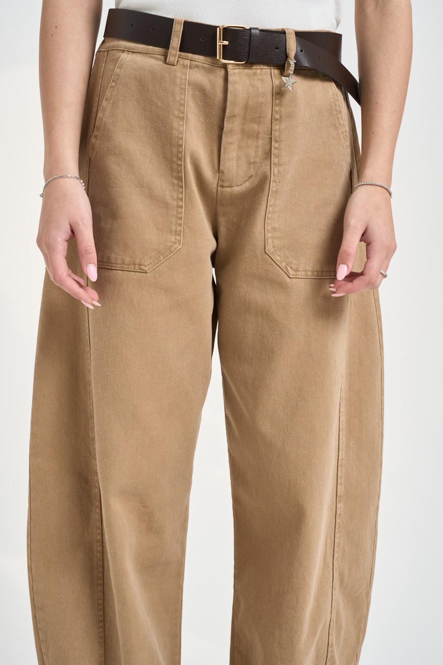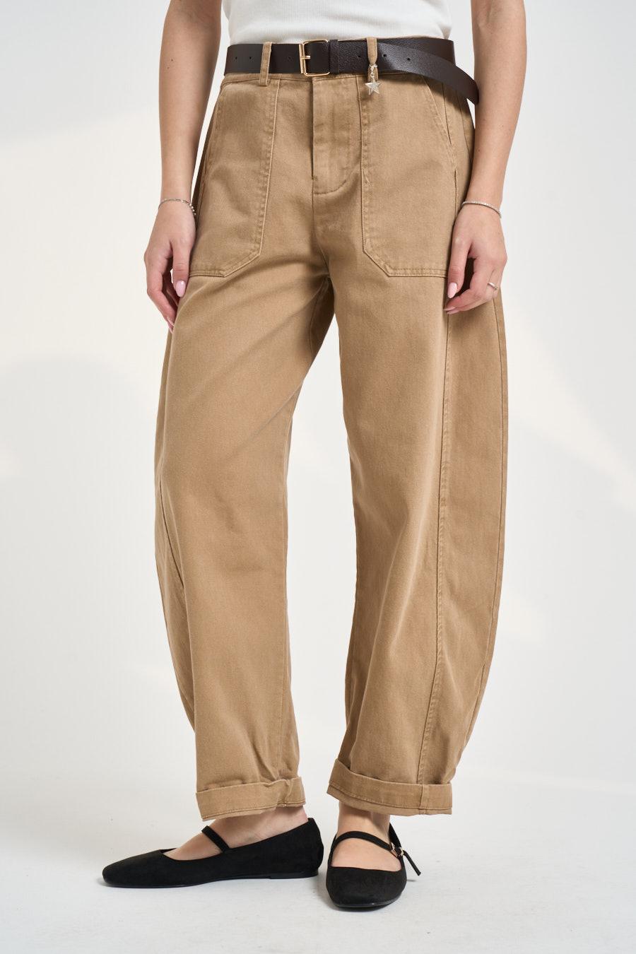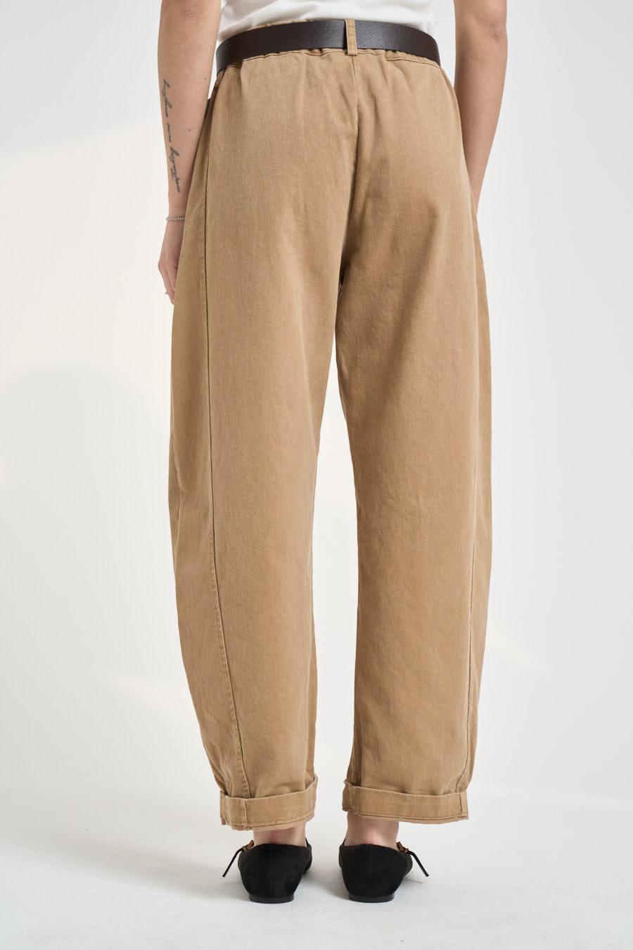 SUSY MIX Pantalone donna balloon cammello. Modello a vita alta con passanti e cintura in coordinato, caratterizzato da chiusura frontale con zip e bottone coperto. Linea morbida con gamba ampia leggermente affusolata al fondo e risvolto, impreziosita da maxi tasche applicate sul davanti e tasche posteriori a filo. Composizione: cotone. La modella è alta 172cm e indossa la taglia S.