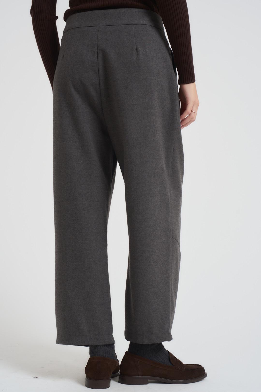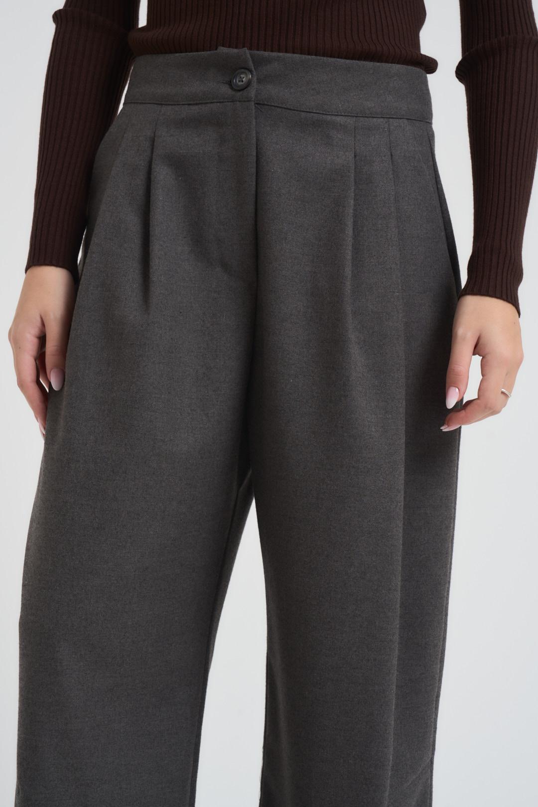 VICOLO Pantalone donna balloon grigio scuro. Modello in flanella con pinces sul davanti, due tasche a filetto e chiusura con zip e bottone. Passanti in vita. Composizione: 65% poliestere 33% viscosa 2% elastan. La modella è alta 172 cm e indossa la taglia S.