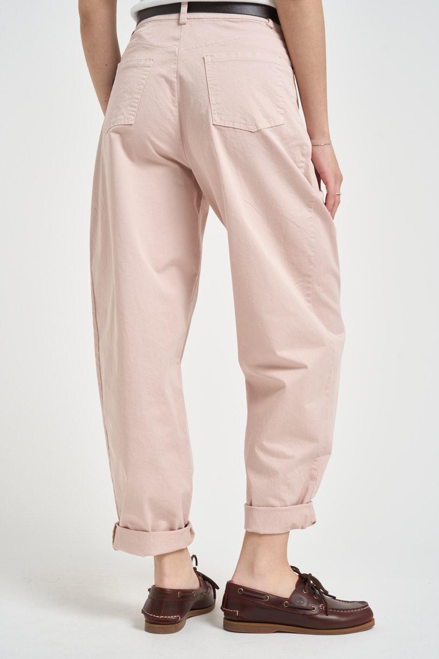 SUSY MIX Pantalone donna balloon rosa cipria. Modello con chiusura frontale con cerniera e bottone. Passanti in vita. Cinque tasche. Composizione: 100% cotone. La modella è alta 172 cm e indossa la taglia XS.