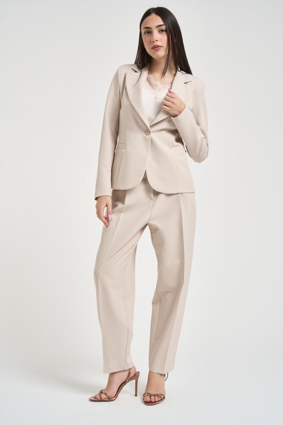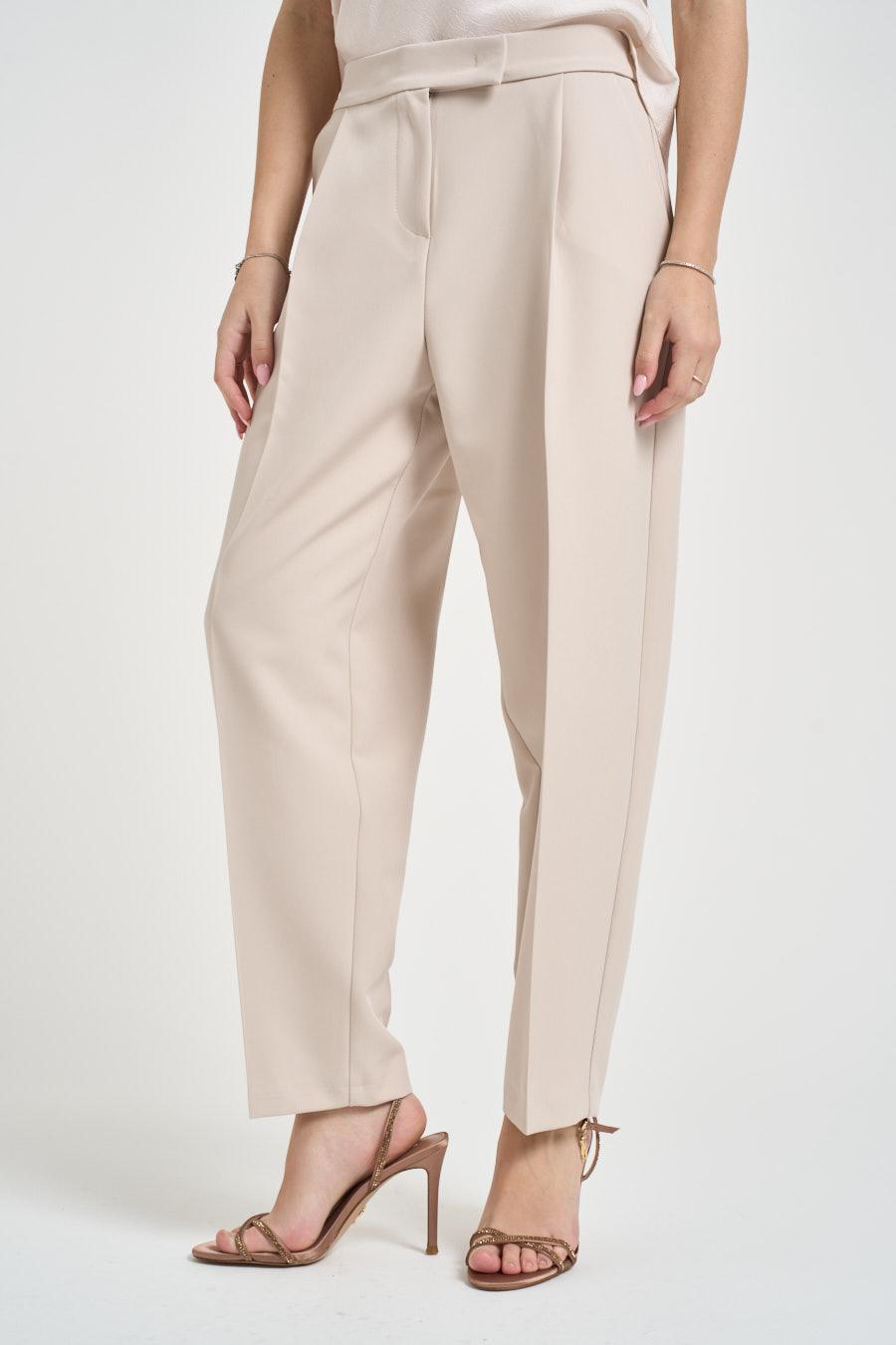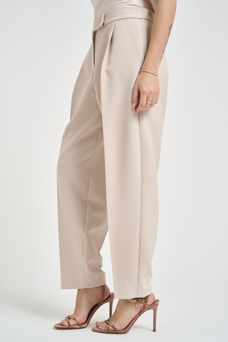 MARYLEY Pantalone donna barrel sabbia. Modello a vita alta. Chiusura frontale con gancio e zip nascosta. Piences frontali. Vestibilità regolare con lunghezza alla caviglia. Vita elasticizzata. Tasche laterali e tasca sul retro a filo. Composizione: 90% poliestere, 10% elastane. La modella è alta 172 cm e indossa la taglia S.