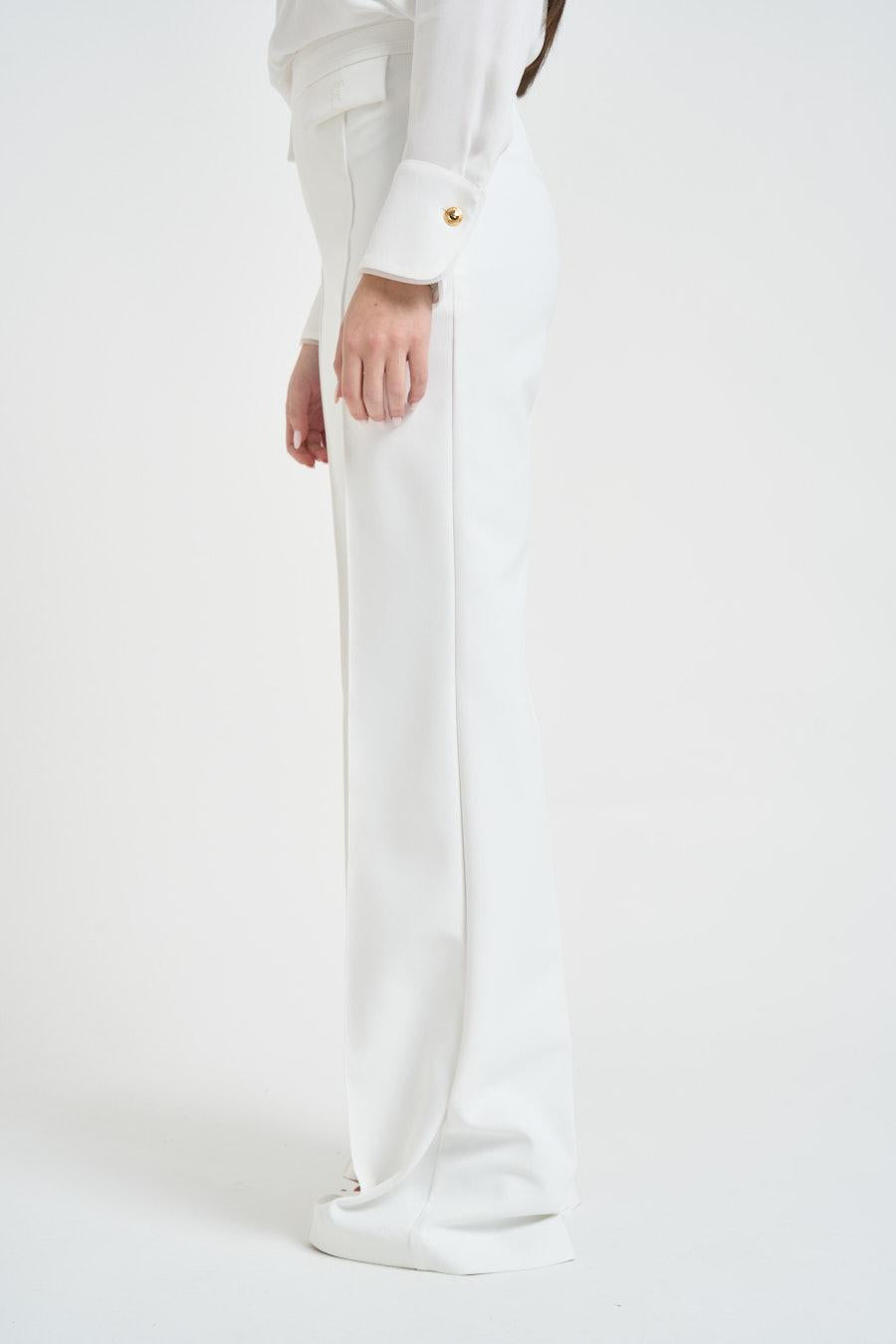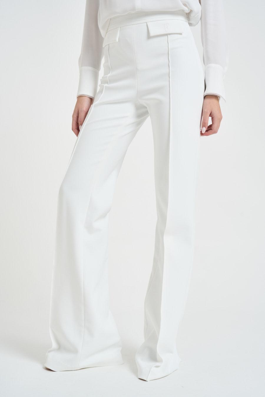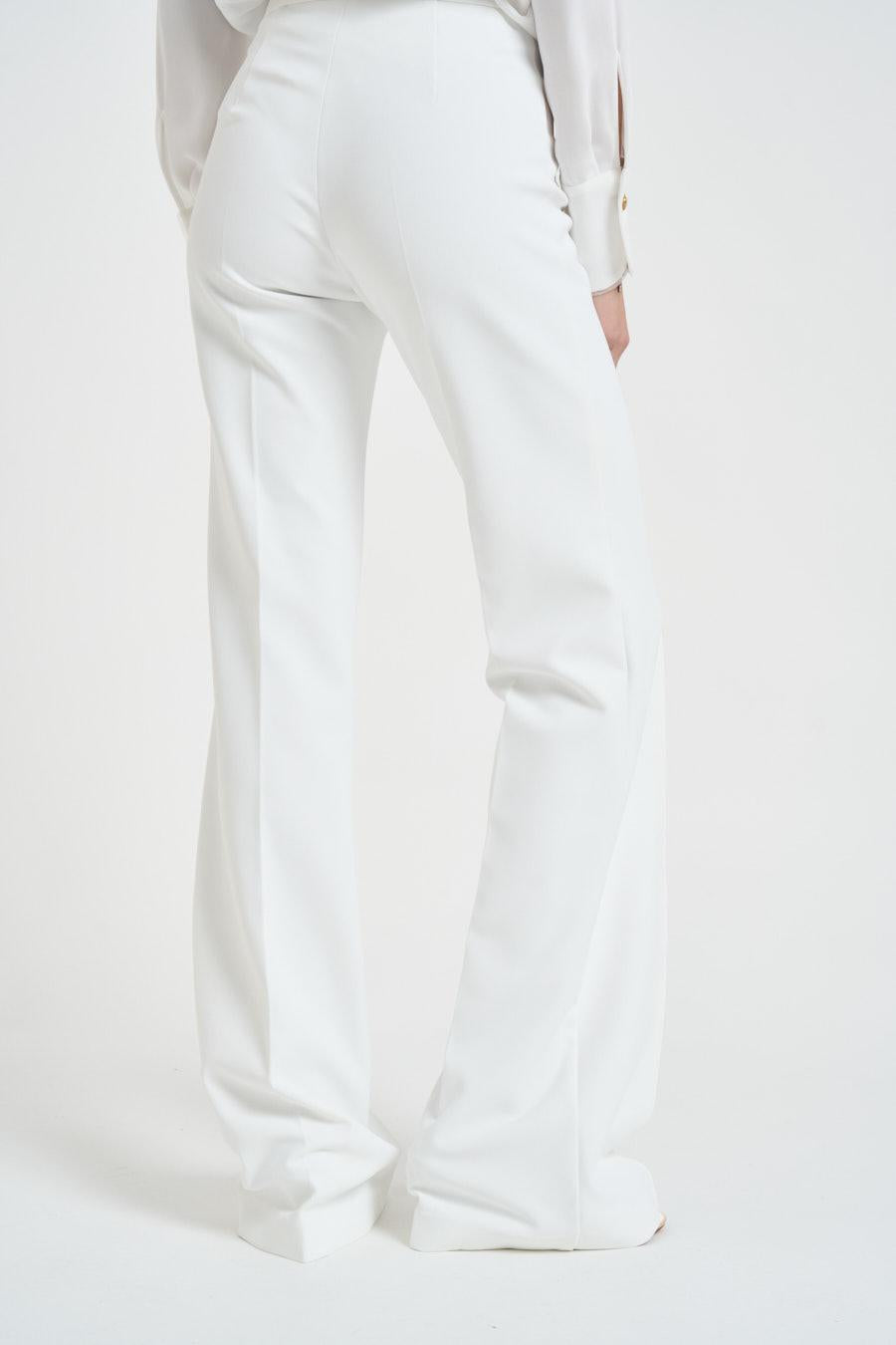 ELISABETTA FRANCHI Pantalone donna gamba dritta bianco. Modello in doppio crêpe stretch. Pieghe. Vestibilità regolare. Due patte sul davanti impreziosite dal logo ricamato in filo e in tono. Composizione: 96% poliestere, 4% elastane. La modella è alta 172 cm e indossa la taglia 40.