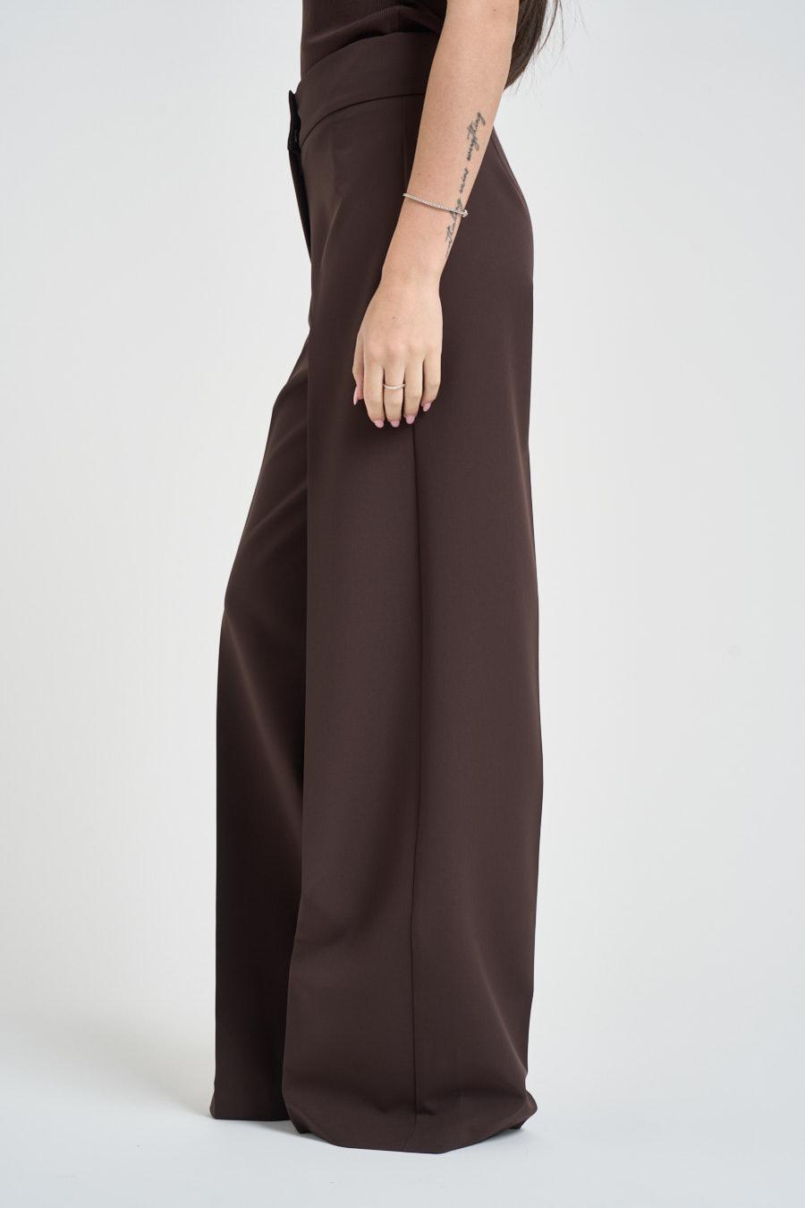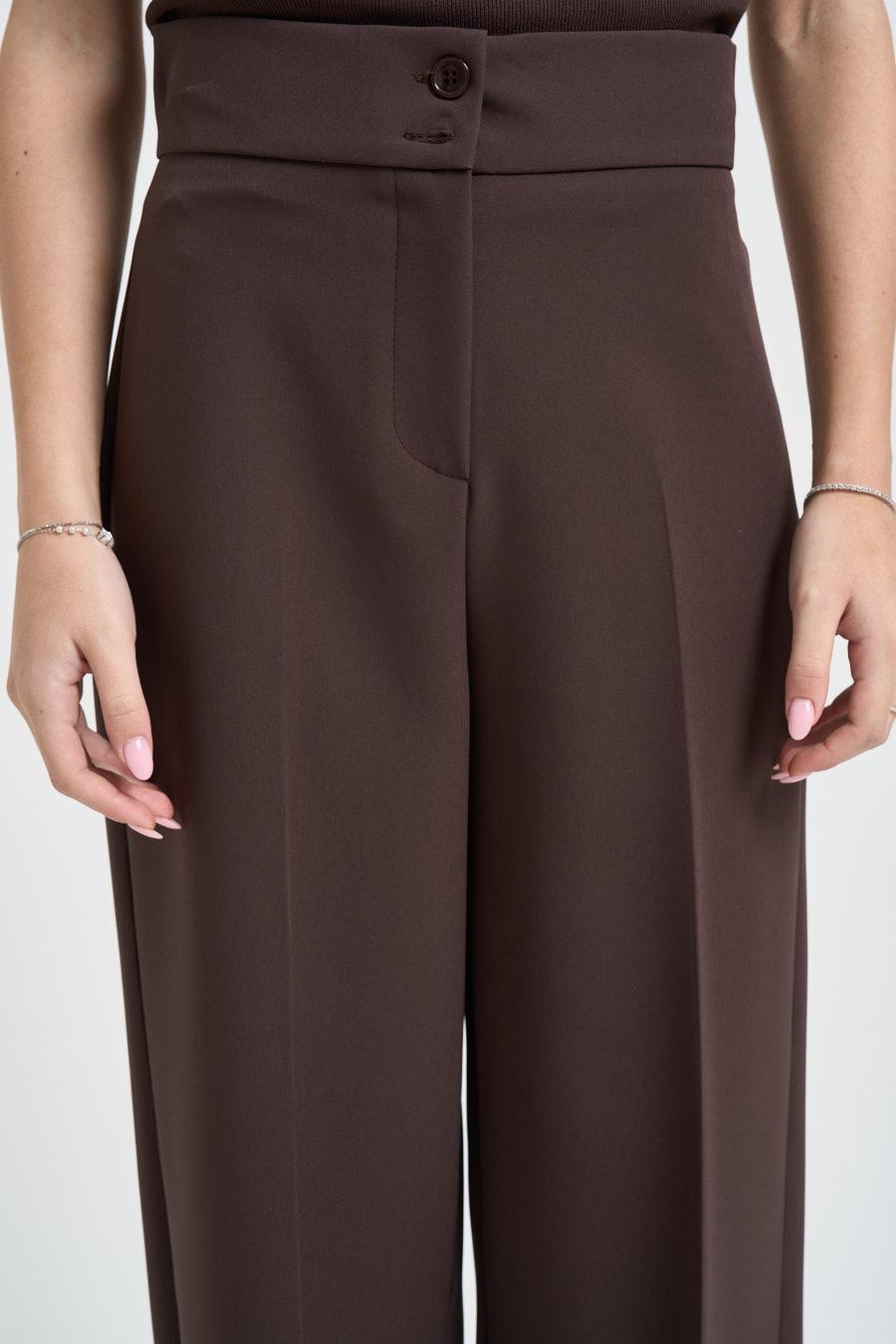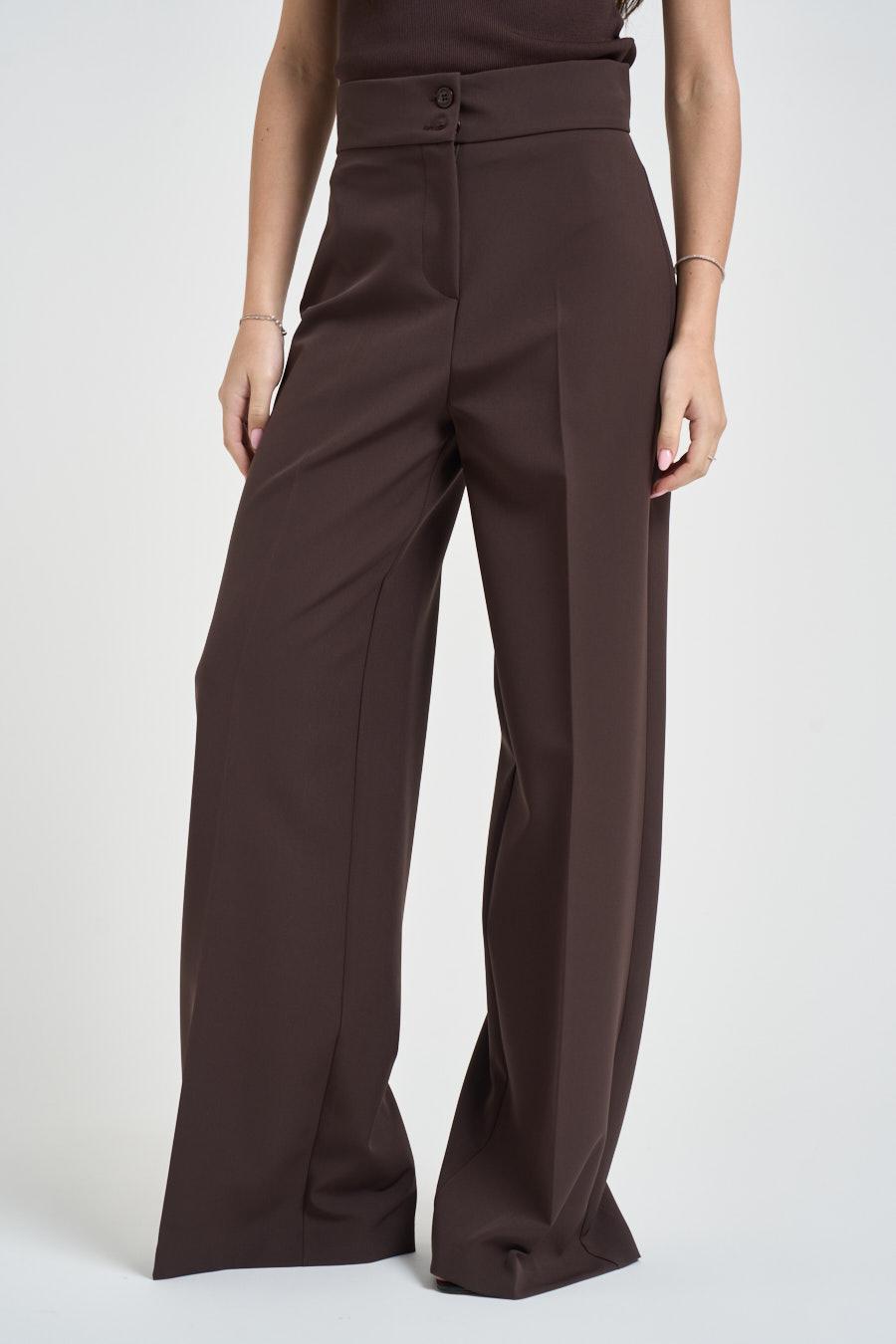MARYLEY Pantalone donna gamba larga moro. Modello a vita alta con pieghe. Cintura struttura. Chiusura frontale con cerniera e doppio bottone. Tasche laetrali. Tasca a filo sul retro. Composizione: 90% poliestere, 10% elastane. La modella è alta 172 cm e indossa la taglia S.