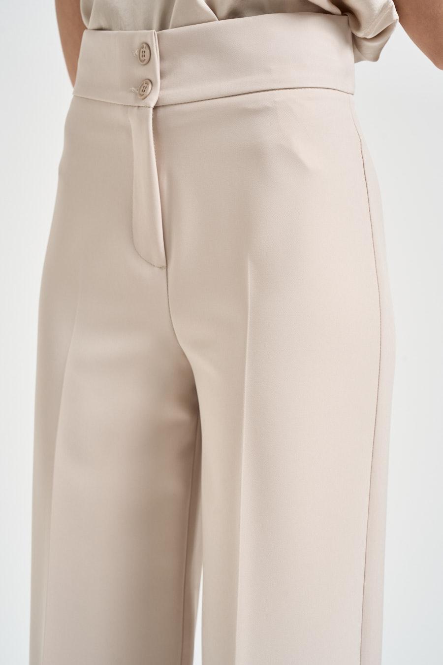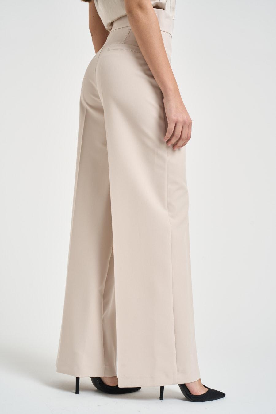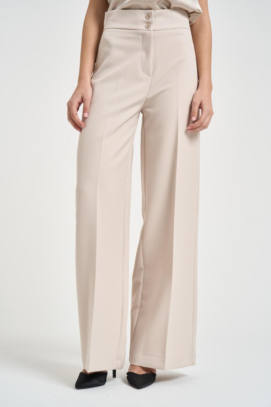 MARYLEY Pantalone donna gamba larga sabbia. Modello a vita alta con pieghe. Cintura struttura. Chiusura frontale con cerniera e doppio bottone. Tasche laetrali. Tasca a filo sul retro. Composizione: 90% poliestere, 10% elastane. La modella è alta 176 cm e indossa la taglia S.