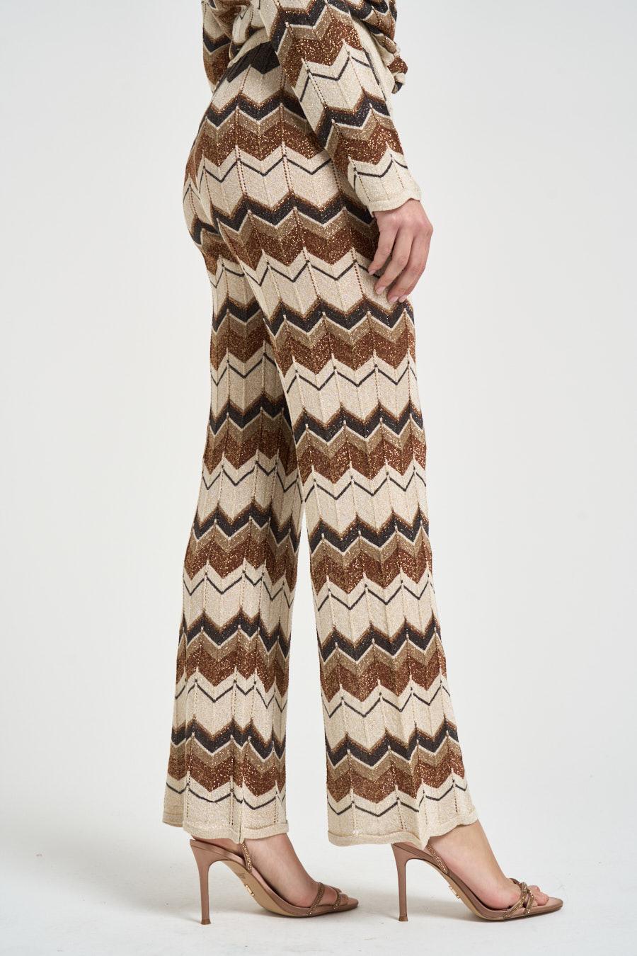 SOUVENIR CLUBBING Pantalone donna in maglia chevron multicolor. Modello a vita alta con fascia elastica in vita e linea dritta leggermente svasata al fondo che slancia la silhouette. Realizzato in maglia lavorata con fantasia zig-zag nei toni del beige, marrone e nero, arricchita da sottili fili luminosi che donano un elegante effetto brillante. Struttura a maglia traforata che crea un raffinato gioco di texture e rende il capo ideale anche come completo coordinato. Composizione: 70% viscosa, 15% poliammide, 15% poliestere. La modella è alta 176cm e indossa la taglia S.