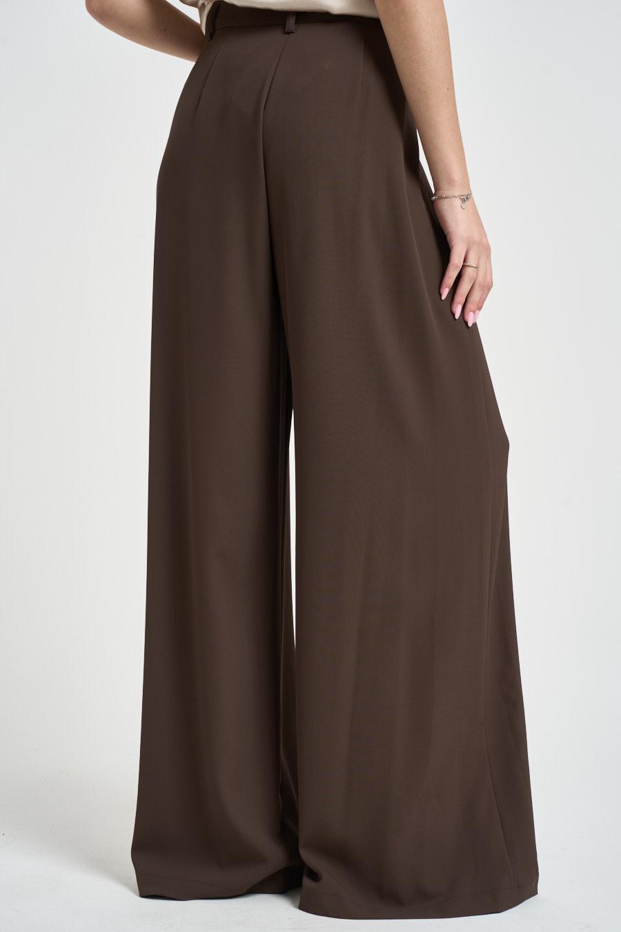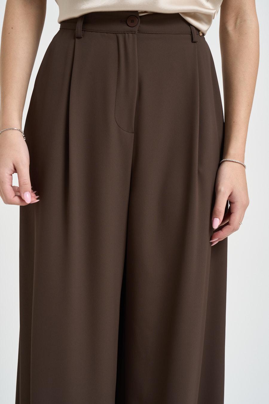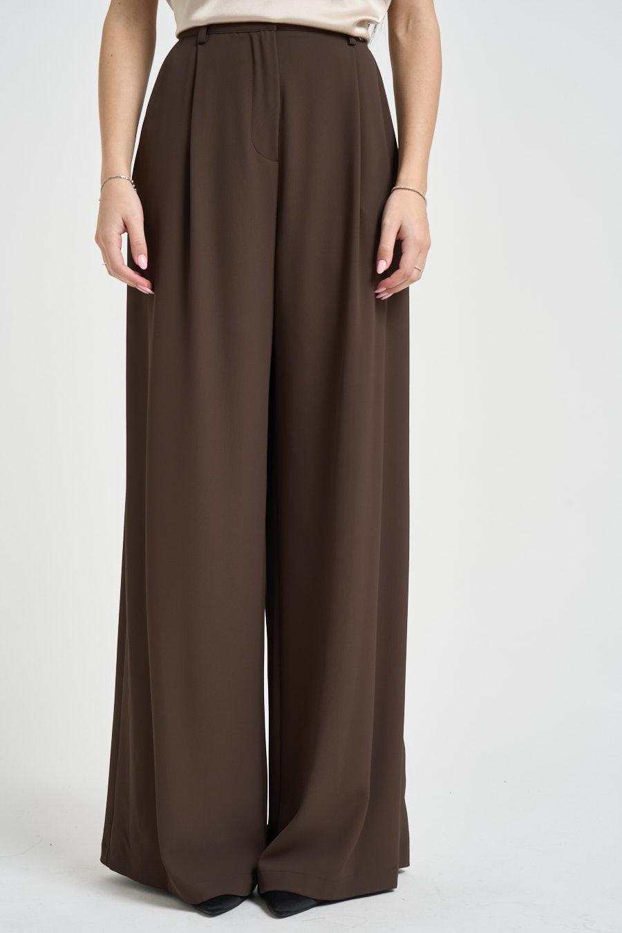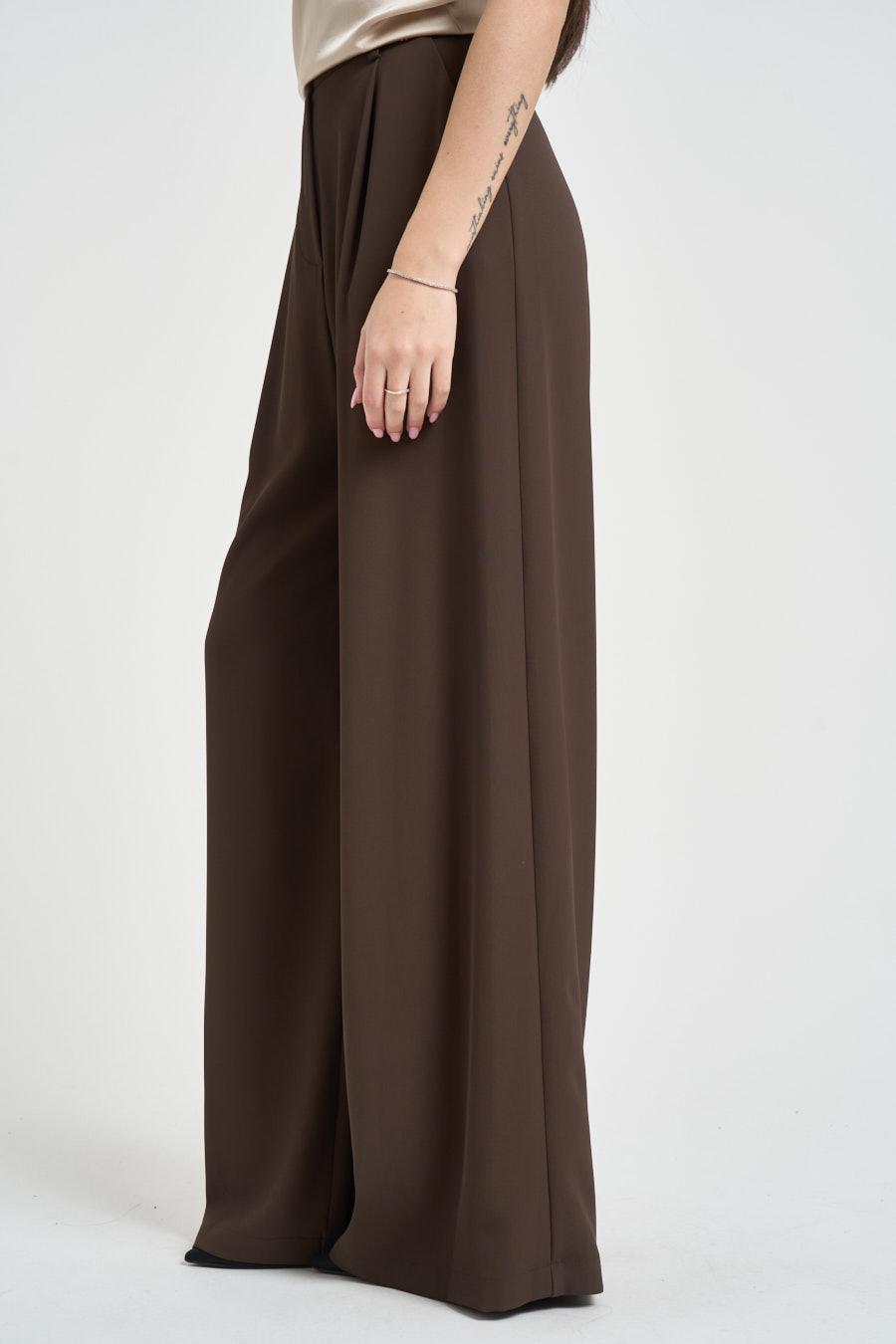 PHILIA LOFT Pantalone donna marrone ampio. Modello palazzo con gamba ampia e linea morbida che scivola lungo la silhouette, valorizzata da leggere pieghe frontali che donano movimento e raffinatezza. Chiusura con zip laterale invisibile e passanti in vita per eventuale cintura, struttura pulita sul retro per un effetto minimal e sofisticato. Composizione: 98%poliestere 2%elastan. La modella è alta 172cm e indossa la taglia S.